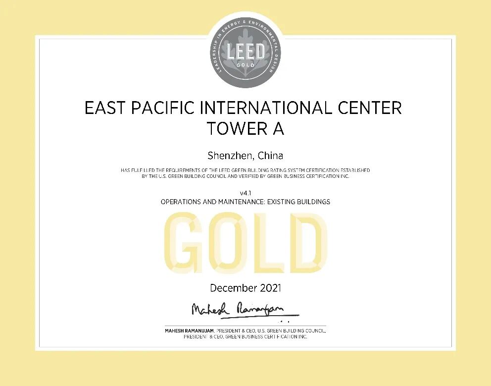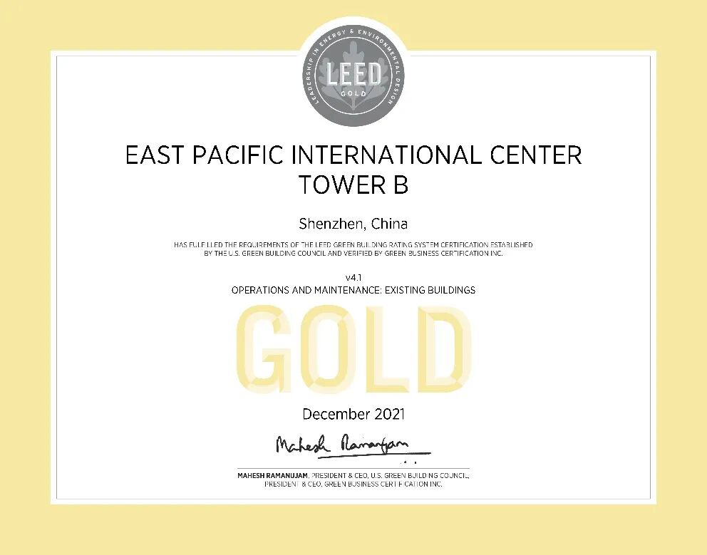 近日,由筑博科技提供认证咨询服务的东海国际中心A、B座办公楼荣获由美国绿色建筑协会(USGBC)颁发的LEED V4.1 O+M(既有建筑:运营与维护类别)金级认证证书。