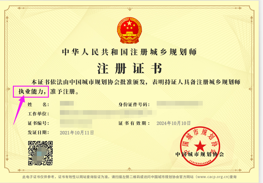 注册城乡规划师注册证书:具备注册城乡规划师执业能力