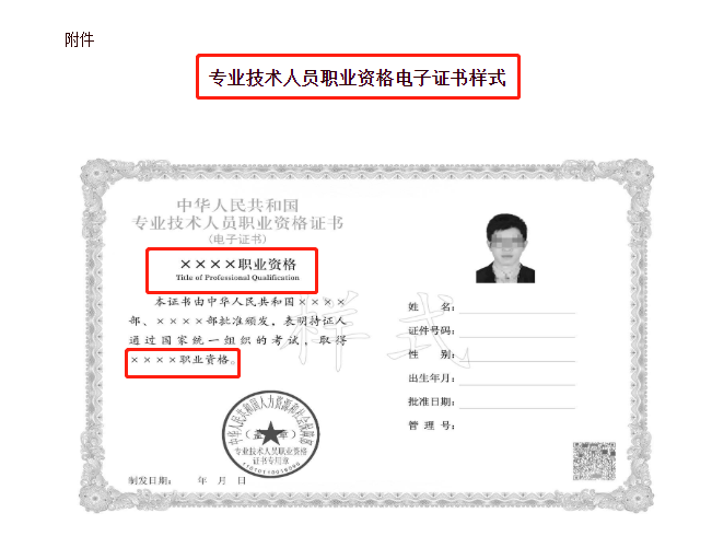 二、下列专业技术人员职业资格的电子证书使用“中华人民共和国人力资源和社会保障部专业技术人员职业资格证书专用章”电子印章(见附件样式1)。