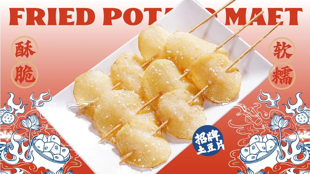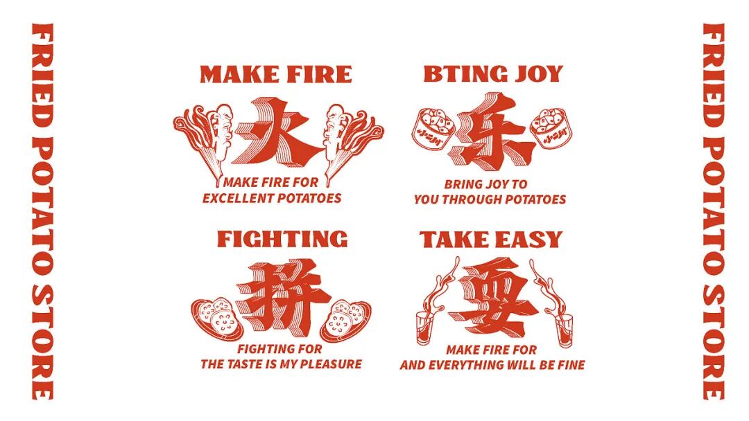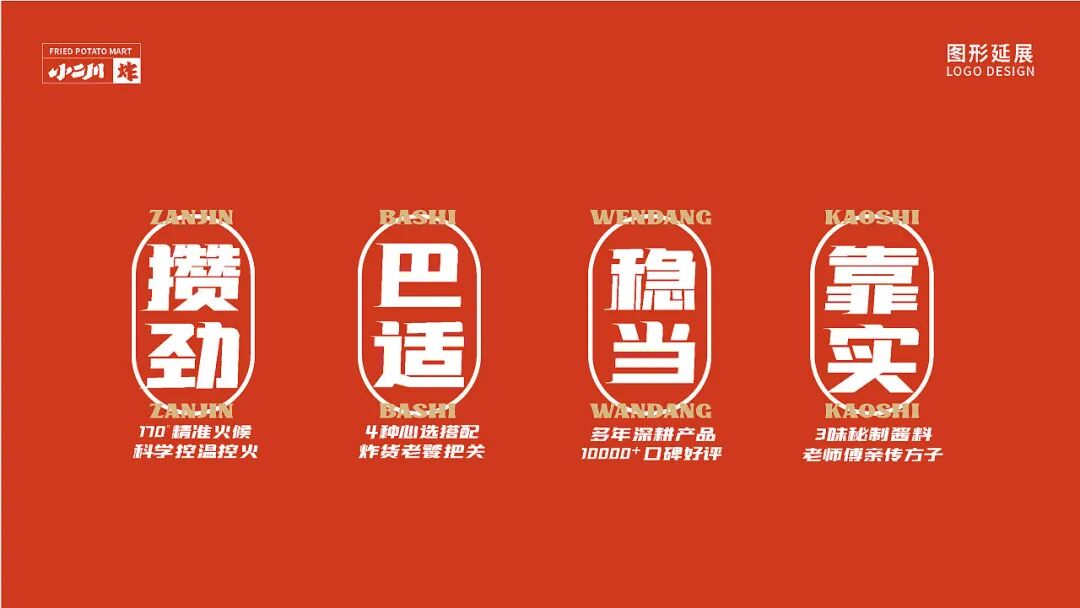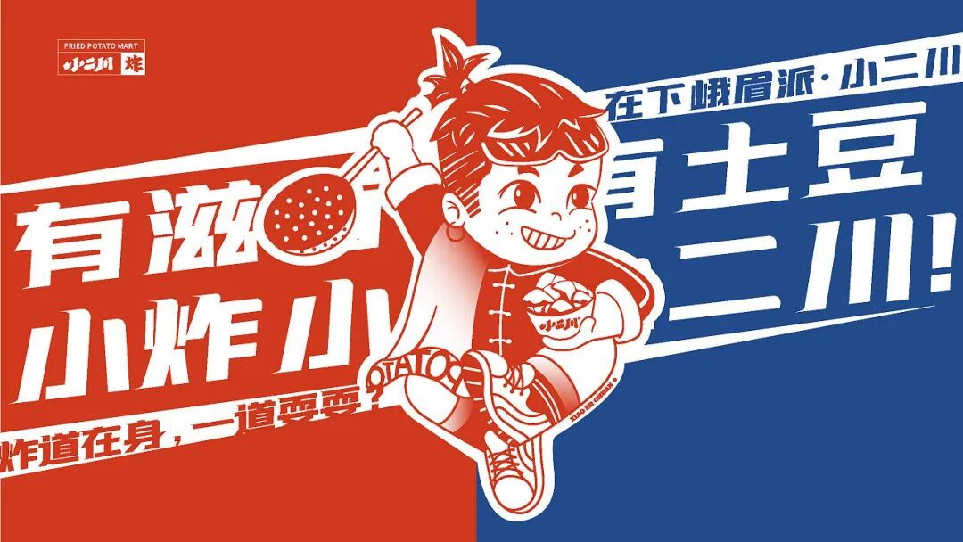 设计上,字形提取了篆书和具有东方古韵的隶书笔画相结合,并根据品牌调性进行组合笔画的处理,现代中又带有传统韵味。IP人物--小二(TO DO),他师承峨眉派·香积厨,有着走遍天下的梦想,希望能结识各路各流,交流功夫、切磋他的炸土豆之道。