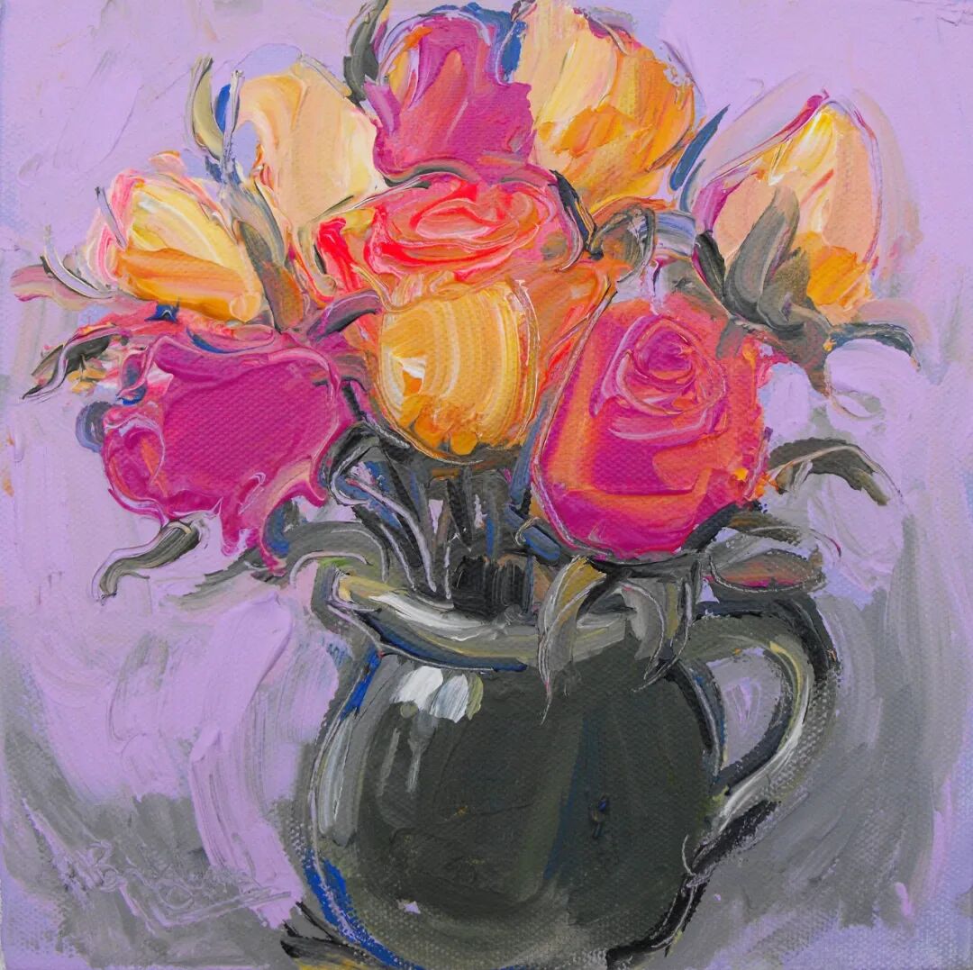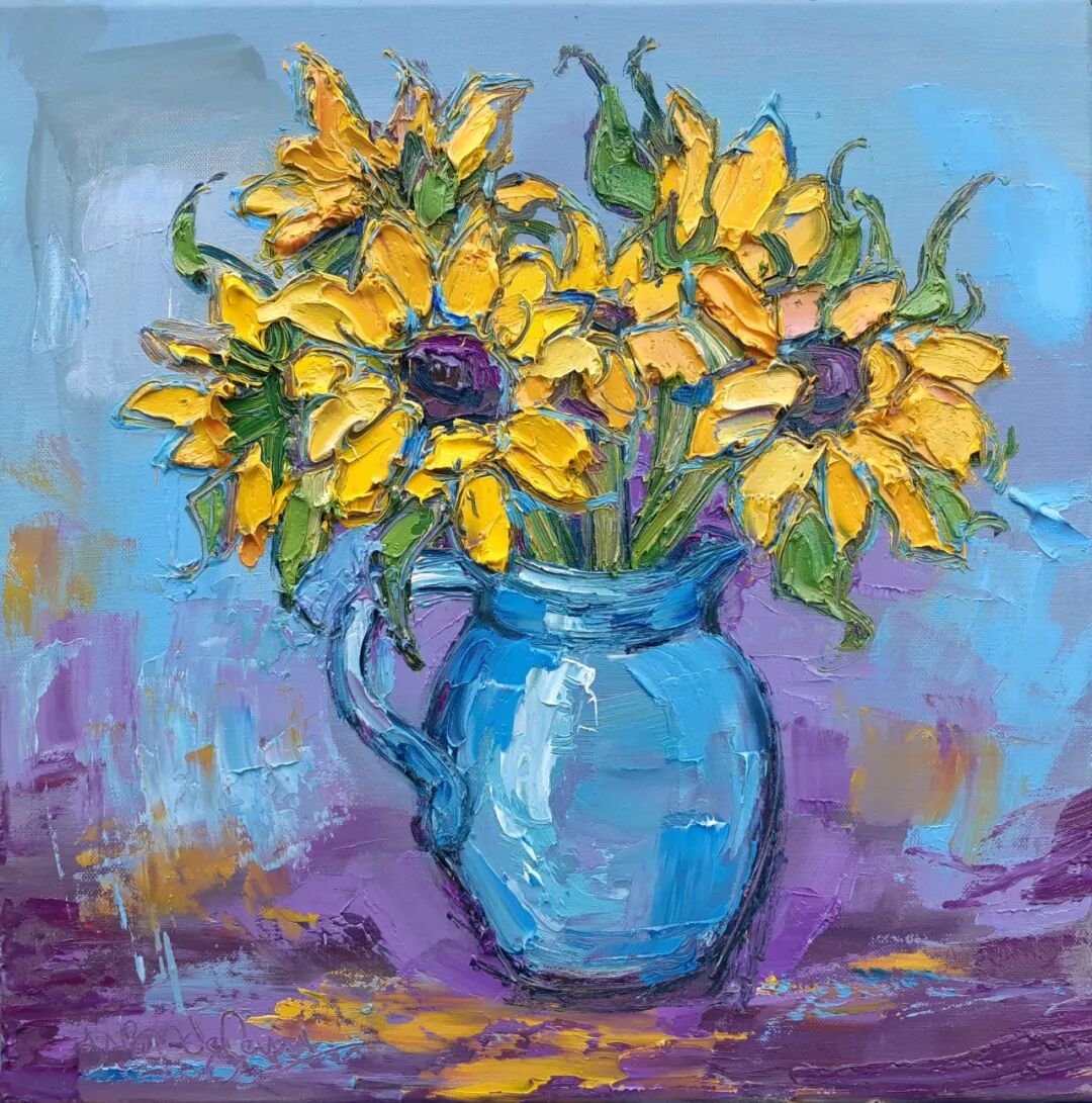 她在油画中使用大胆、有力、有节奏的厚涂颜料笔触,结合细腻的笔法。