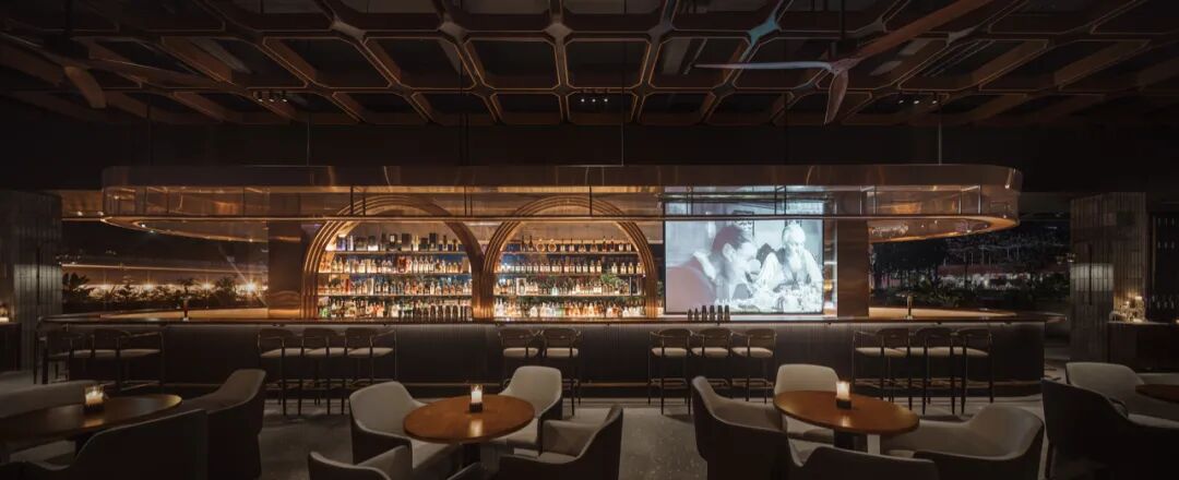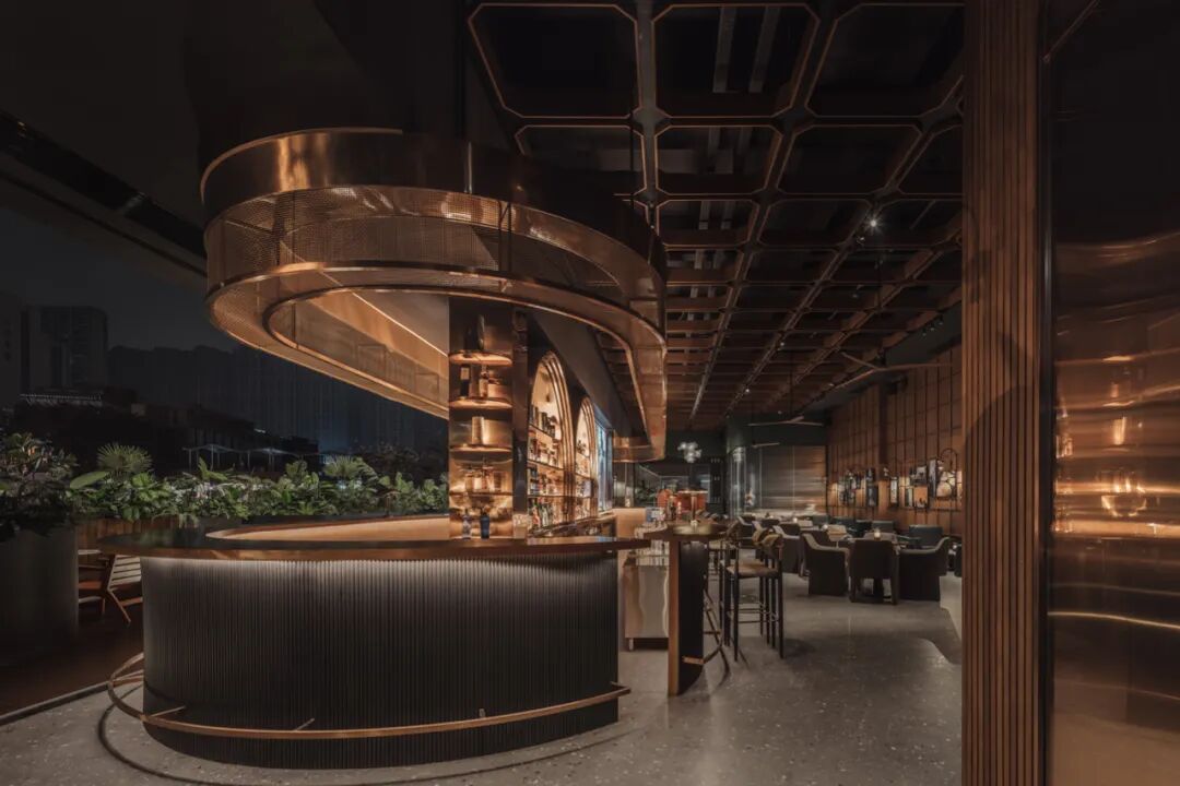 吧台用了釉质实木桌面和铜制金属酒柜,这两种材质的结合让调酒区兼具实用和美感,显得复古而摩登。回形的长桌既使室内向室外的延伸,又让人流动线产生更多的交互。