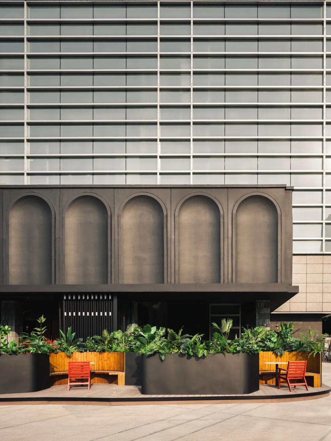 由手工切割打磨的木板拼接成流畅弧形的座位,光滑的石质桌面搭配复古的黑白图案,在落日下闪闪发光。开放的户外卡座以红、黑、绿三色形成明艳的撞色,种植其中的繁茂绿植如同天然屏障,层层掩盖住内部环境,也给邻座间提供了一定的隐私保护。