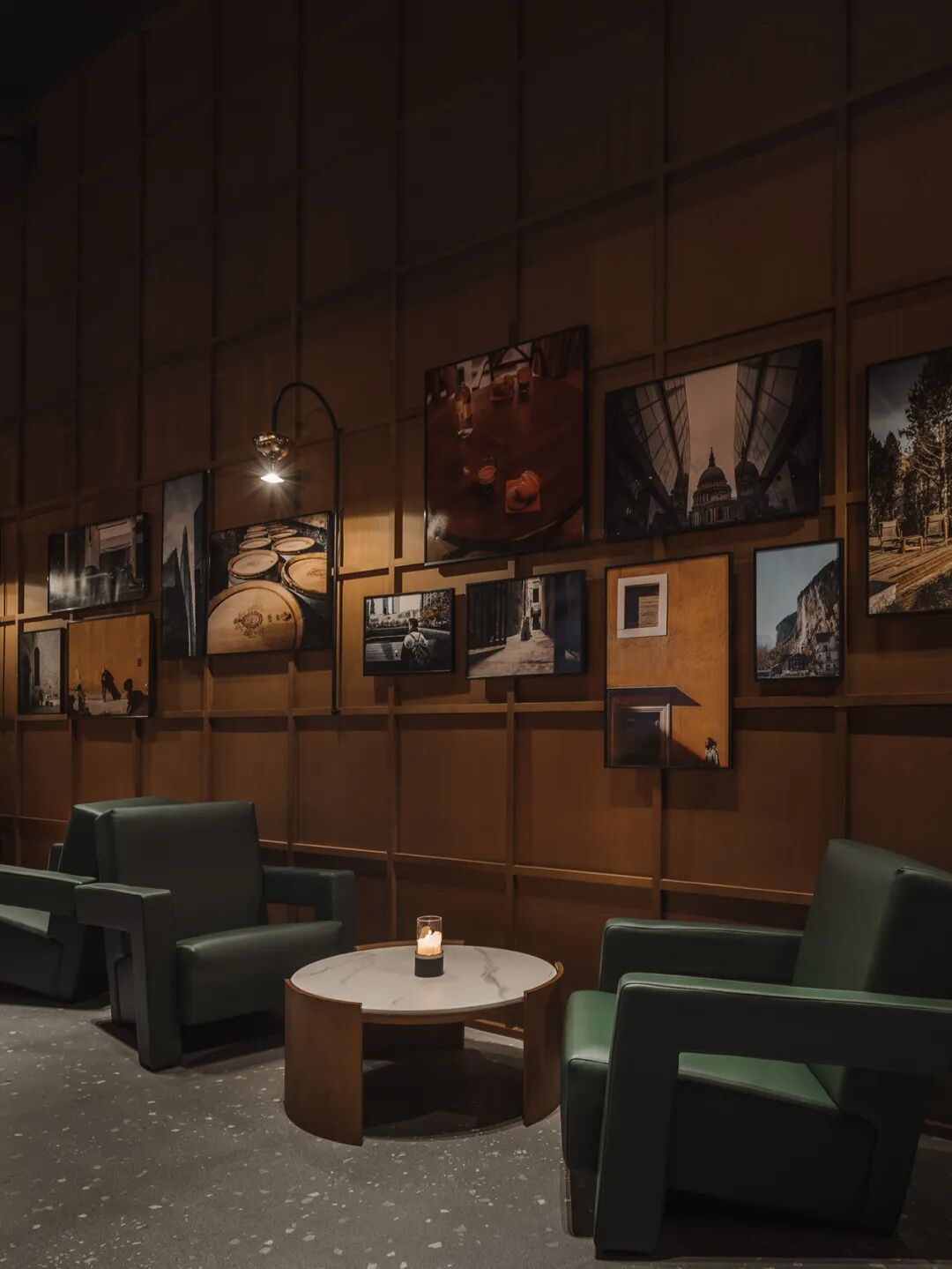 Time威士忌吧内有一面木格子墙,记录了设计师朱海博在异国他乡学习期间遇到的人和事,这些摄影作品被分享给各色来客观看,点缀在他人人生戏剧里的酒杯之中。