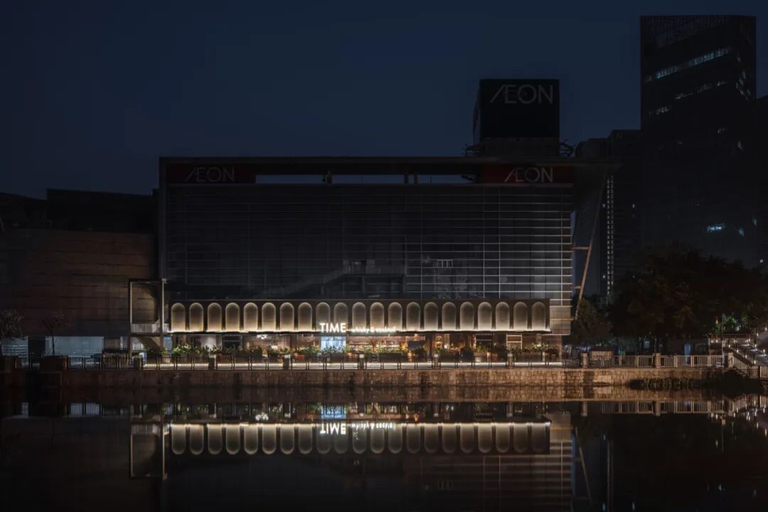 Time酒吧位于佛山的千灯湖畔,设计师为了营造一种神秘感,将外立面做成了黑色拱门,磨砂表面增添了神秘幽深的质感并突出Time这个命名。
