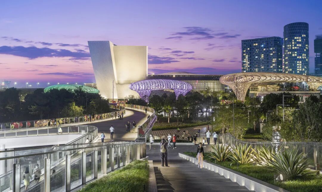 流畅的造型姿态、立体的动线组织、丰富的空间流转、开阔的视野景致,使其成为公园和项目的亮点和打卡地,它远远突破了商业设施单一身份和功能,在艺术性、观赏性、体验感等方面为整个项目增光添彩。