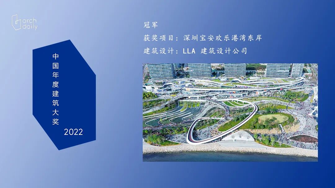 近日,2022 ArchDaily 中国年度建筑大奖公布!据官方数据统计,本届共超过 800个中国项目,共有 10个项目通过三周一轮投票评选入围 ArchDaily China 十佳建筑,经过最终的投票评选,由美国 LLA 建筑设计公司(Laguarda.Low Architects)担纲总体规划和建筑设计的深圳宝安欢乐港湾东岸,获得了2022 ArchDaily 中国年度建筑大奖的冠军!恭喜!