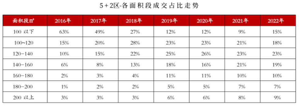 与此同时,回顾近7年5+2区成交面积段变化,除100㎡以下产品出现回升之外,200㎡以上产品成交占比也呈现上升趋势。