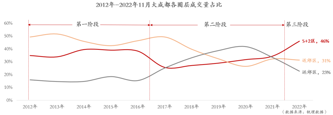 从2012-2016年第一个阶段的“相对平稳、各司其职”,到2016-2021年的“限购令下远郊突围”,再到2022年“买房视野重回主城”,十年间,成都圈层间购买观历经了三大阶段的变化。