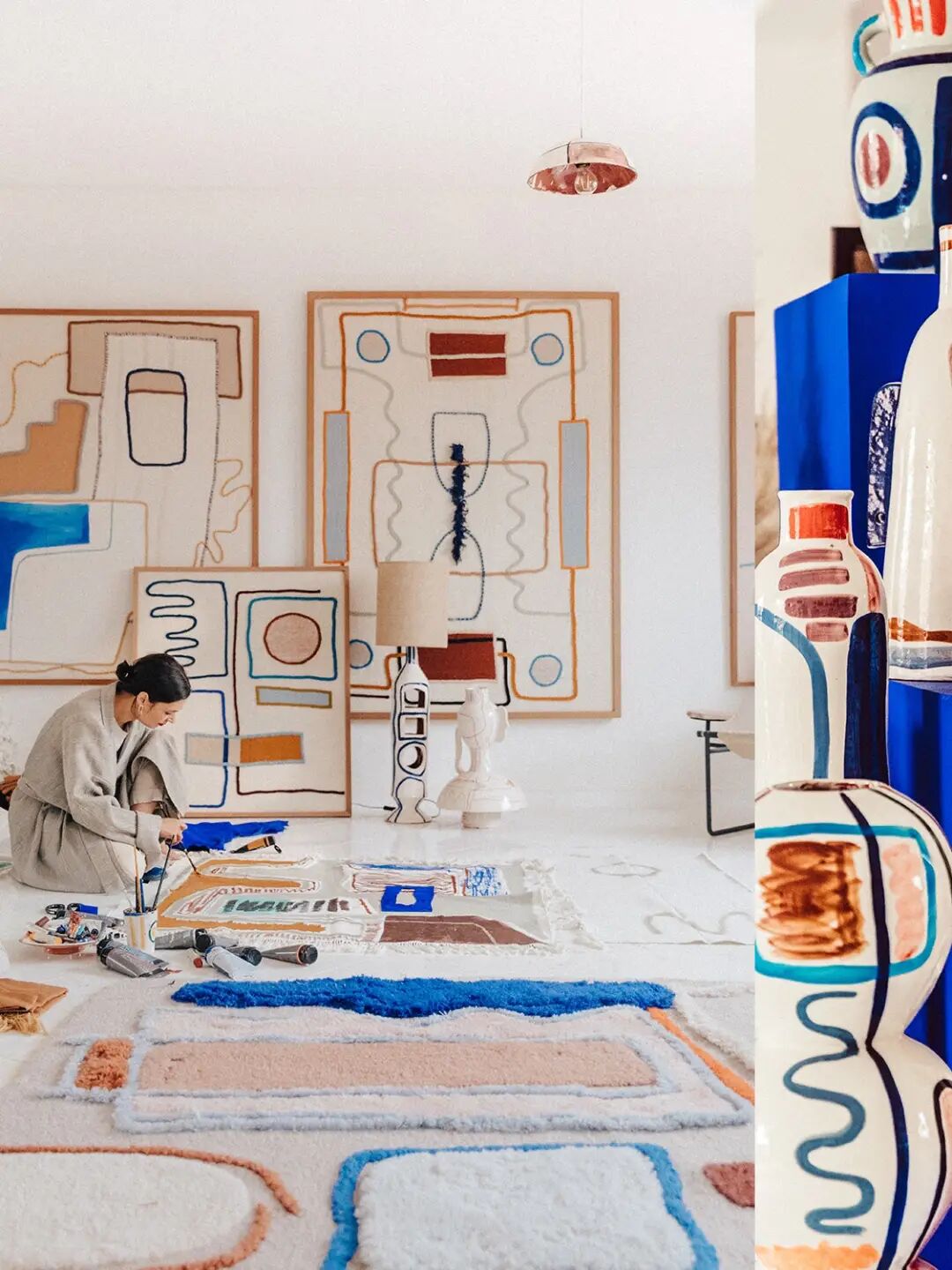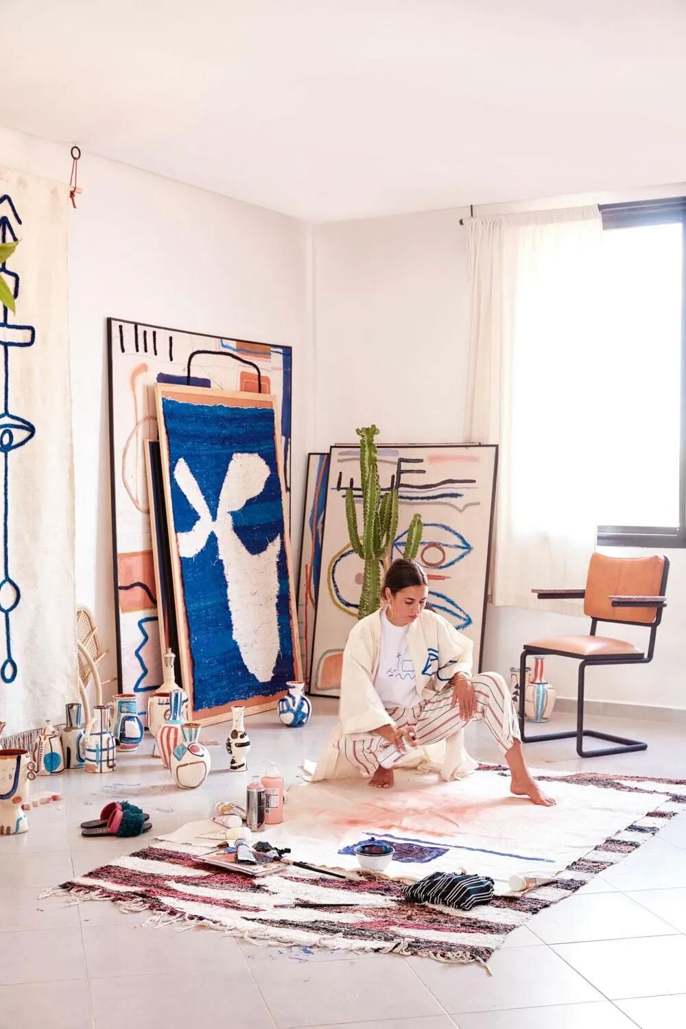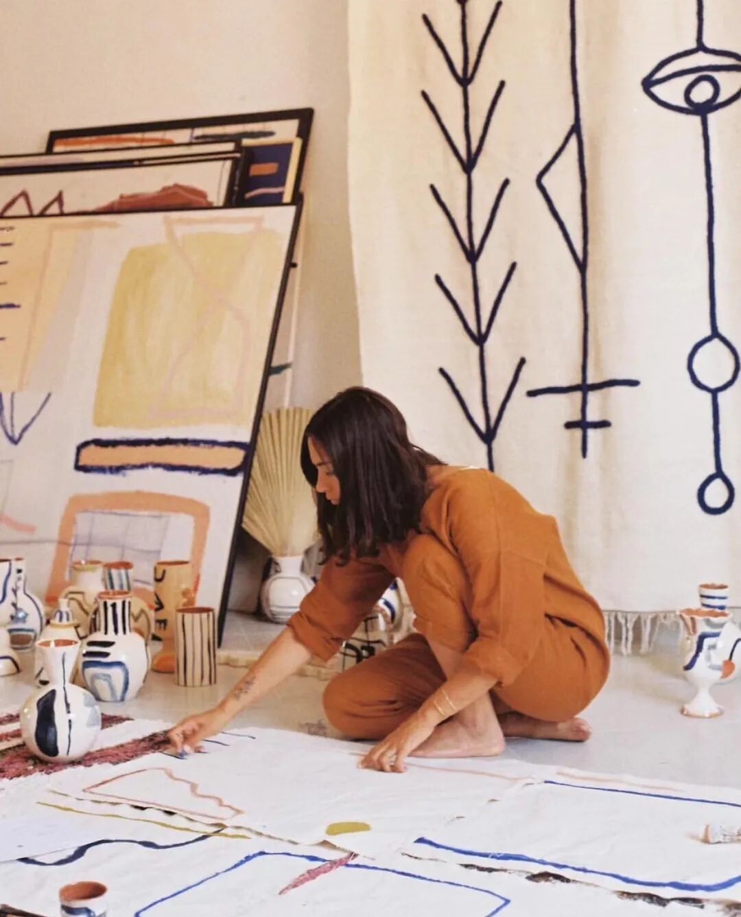 她称自己为“追逐阳光之人”,她最喜欢的事情是一个人坐在几乎了无人烟的沙漠中创作,沉浸于最自由的空间之内。她常常用随意的线条、符号、图形,勾勒北非的宗教、占星文化,颇有毕加索的味道。