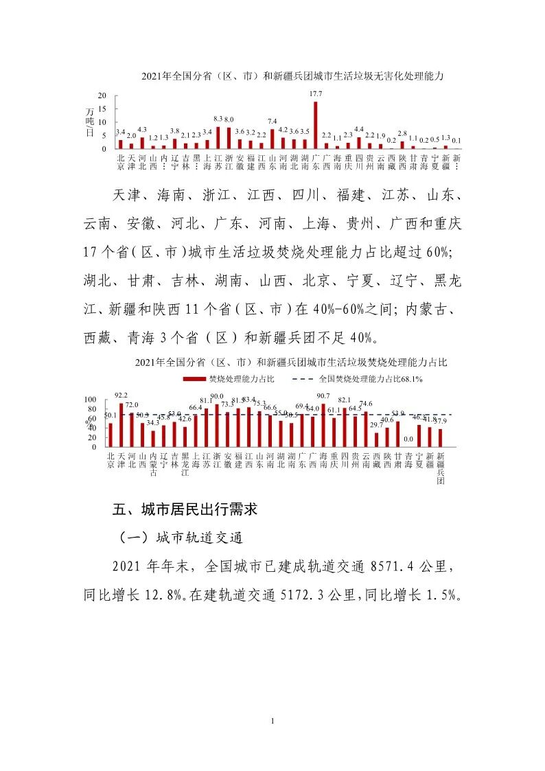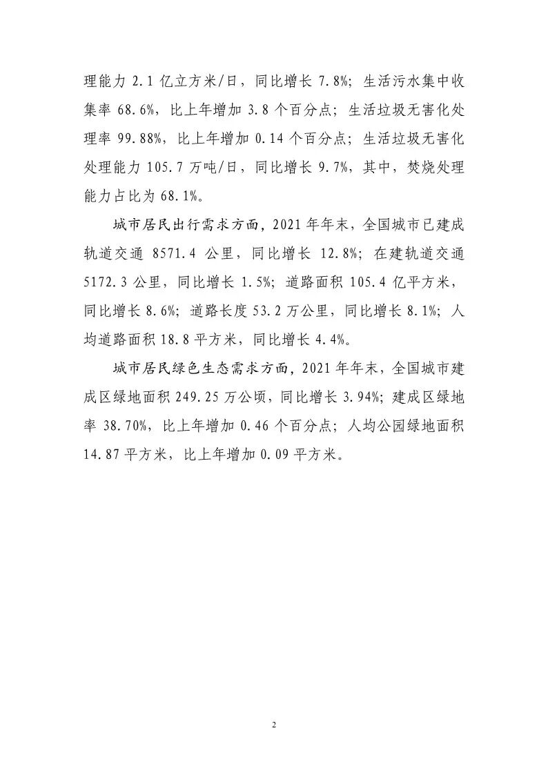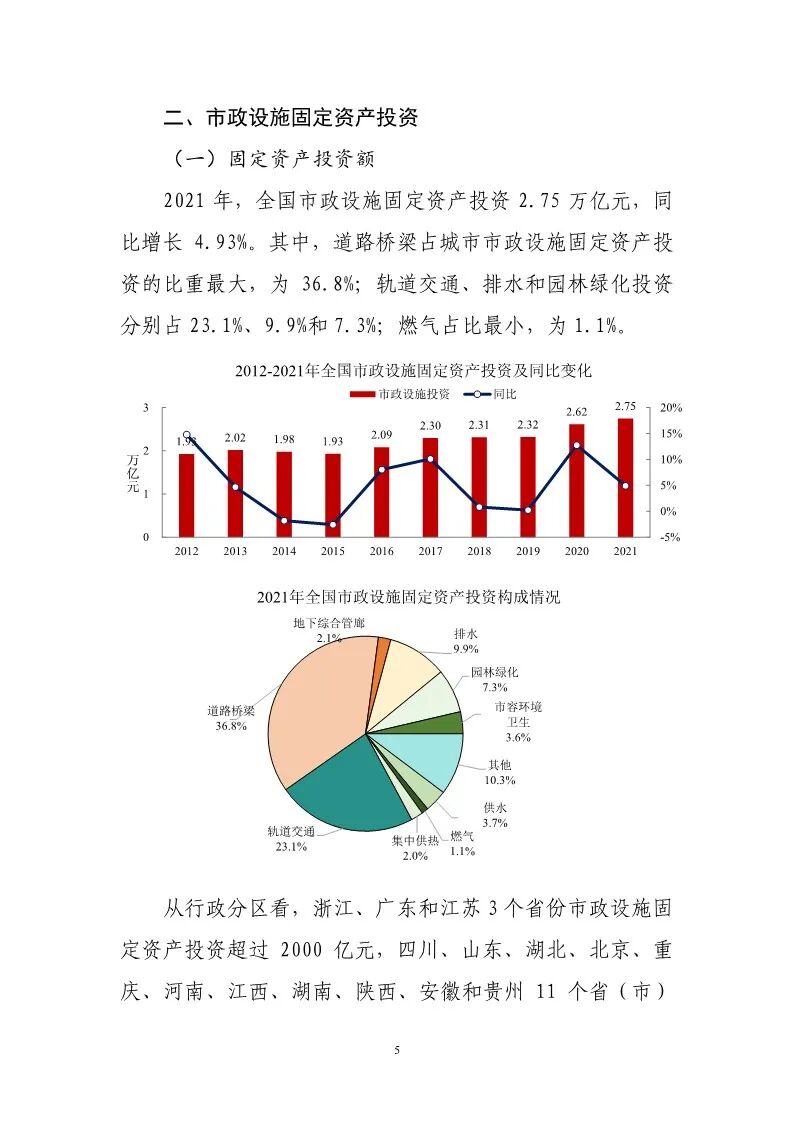 《公报》主要从城市基本情况、市政设施固定资产投资、城市居民生活需求、城市居民环境卫生需求、城市居民出行需求、城市居民绿色生态需求六个方面,对2021年城市建设状况进行了介绍。