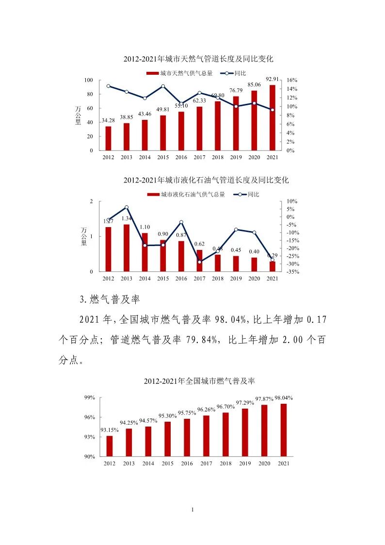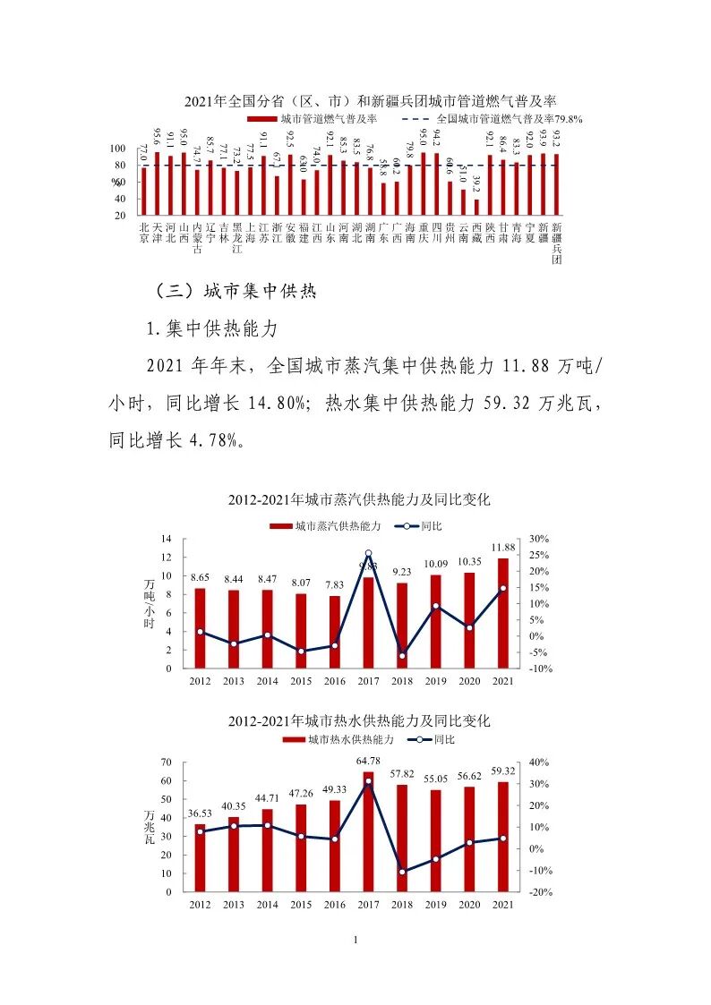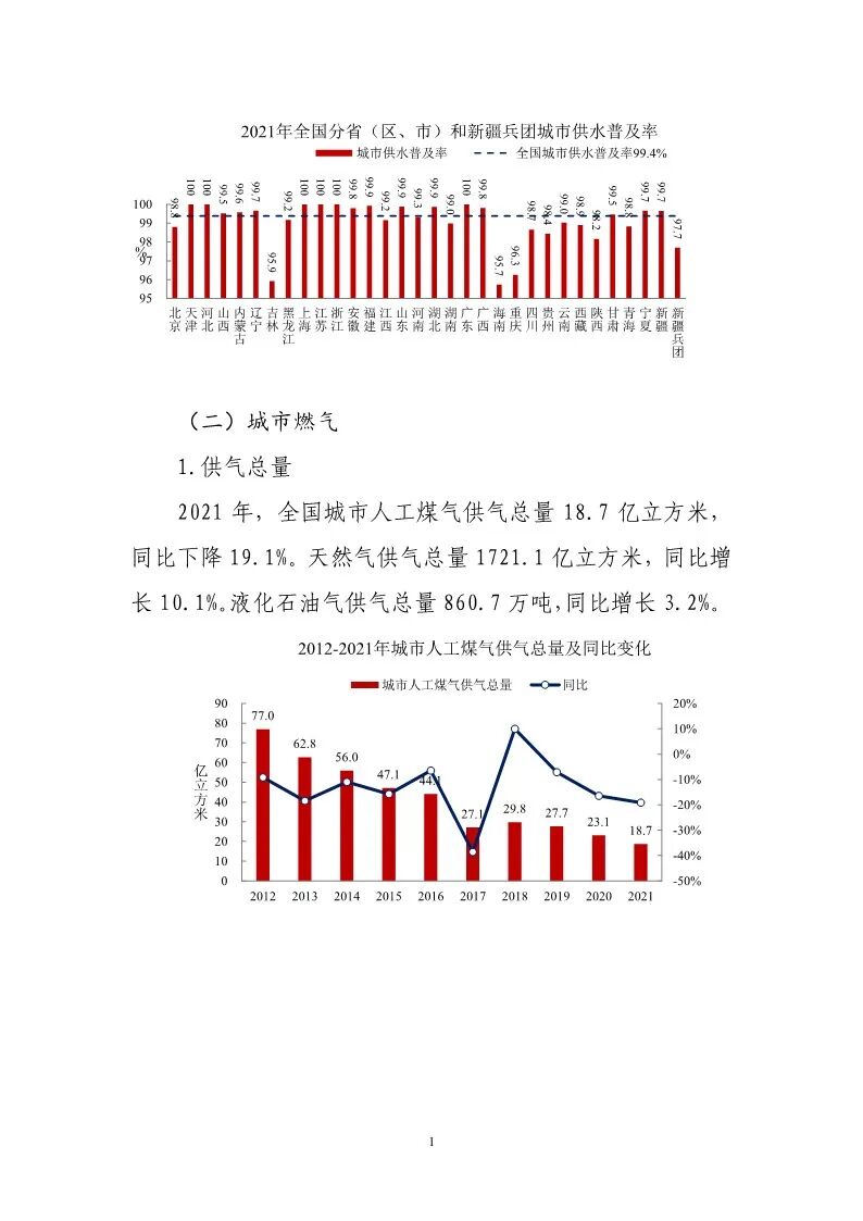 城市居民生活需求方面,2021年,城市人均日生活用水量185.03升;供水普及率99.38%,比上年增加0.39个百分点。燃气普及率98.04%,比上年增加0.17个百分点;管道燃气普及率79.84%,比上年增加2.00个百分点。集中供热面积106.03亿平方米,同比增长7.30%。