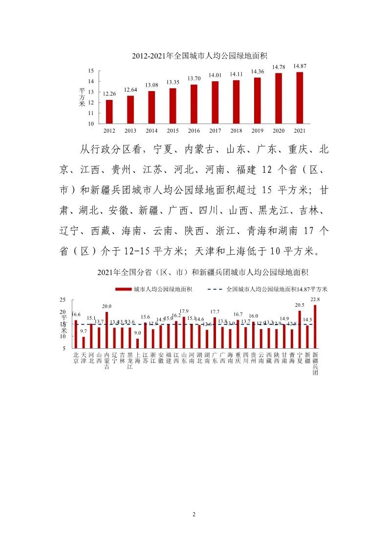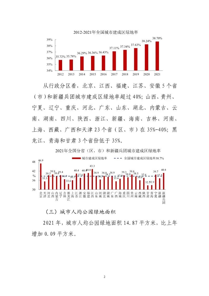城市居民绿色生态需求方面,2021年年末,全国城市建成区绿地面积249.25万公顷,同比增长3.94%;建成区绿地率38.70%,比上年增加0.46个百分点;人均公园绿地面积14.87平方米,比上年增加0.09平方米。