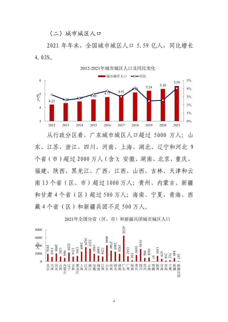 城市基本情况方面,2021年年末,全国城市建成区面积6.24万平方公里,同比增长2.80%;全国城市城区人口5.59亿人,同比增长4.03%。