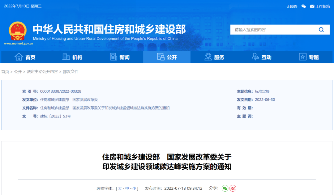 今日,住房和城乡建设部、国家发改委联合发布城乡建设领域碳达峰实施方案。目标在2030年前,城乡建设领域碳排放达到峰值;力争到2060年前,城乡建设方式全面实现绿色低碳转型。
