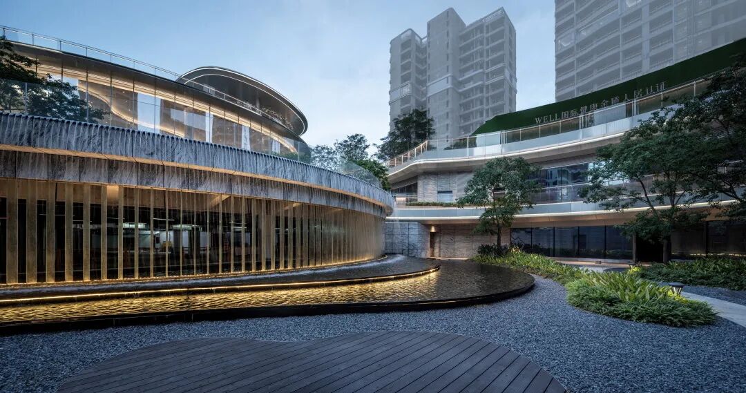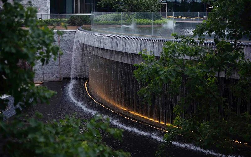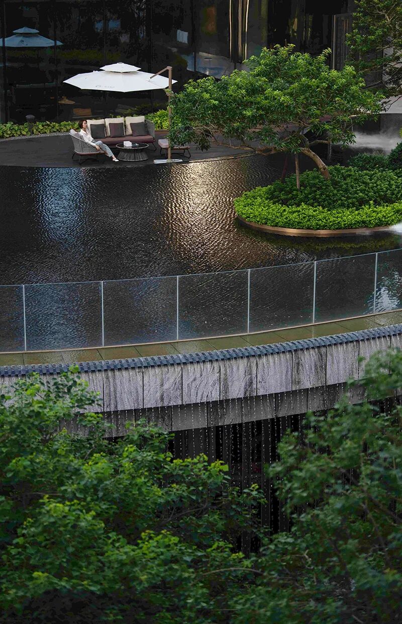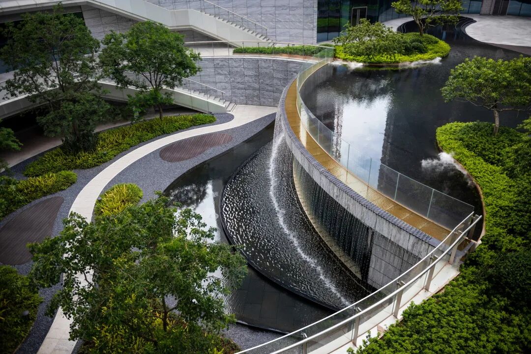 由负一层往负二层跌下的宽大跌水瀑布,风水内流,从上而下,川流不息,如钻石般闪烁,似顽强生命力,每一步都能感受到令人惊奇的景观体验。