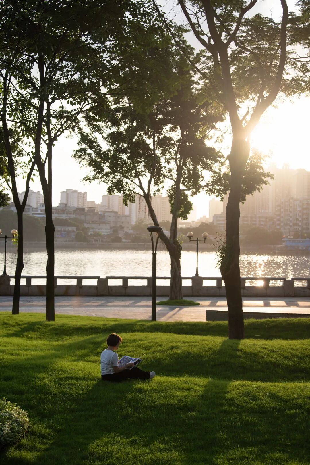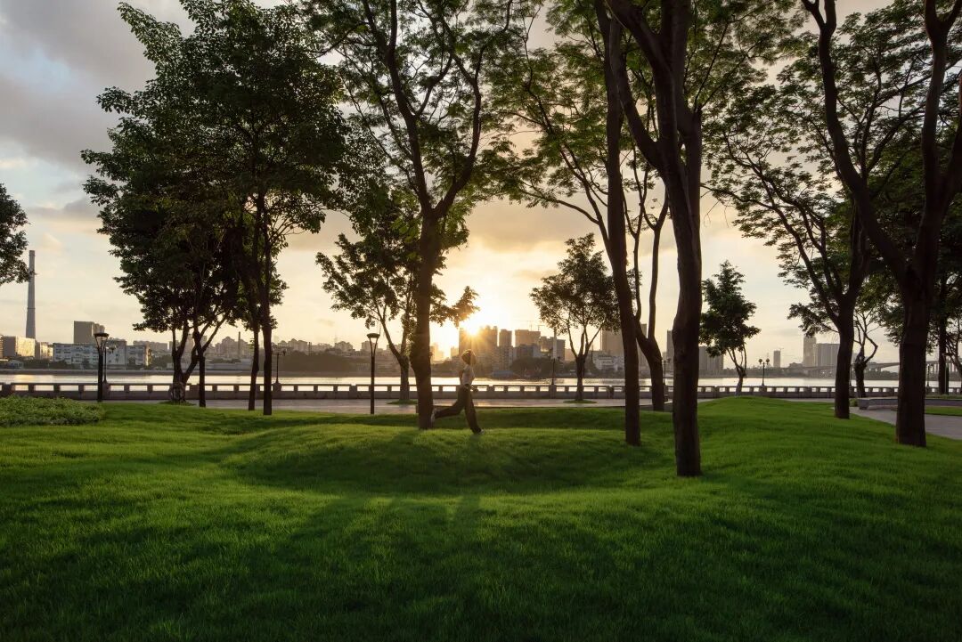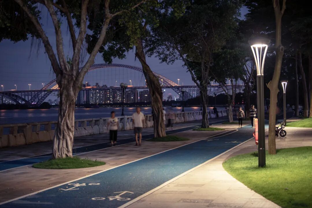 沿江我们设计了10米滨江景观通廊,包括:2.5米骑行道,2.5米设施带,1.5米跑步道,3.5米漫步道,夜幕降临,从商务区归家的人们也多了起来,来这里夜跑,散步,享受江边轻柔的阵阵晚风是洗去一天疲累的最佳选择。