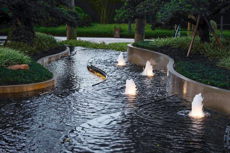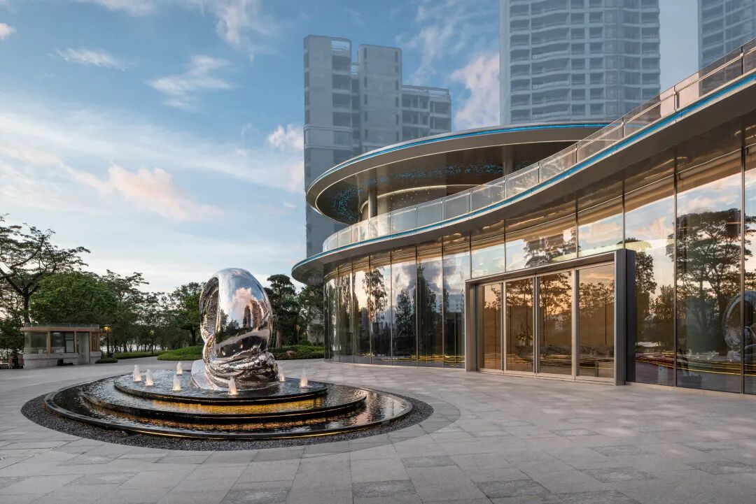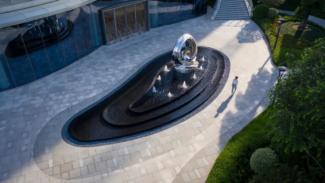 缓步至院落会所花园,由不锈钢弯曲管定制的雕塑,名为:生命之源,水流不断从雕塑周围涌出,跌落出蕴含禅意的流线,彰显尊贵的归家礼仪。