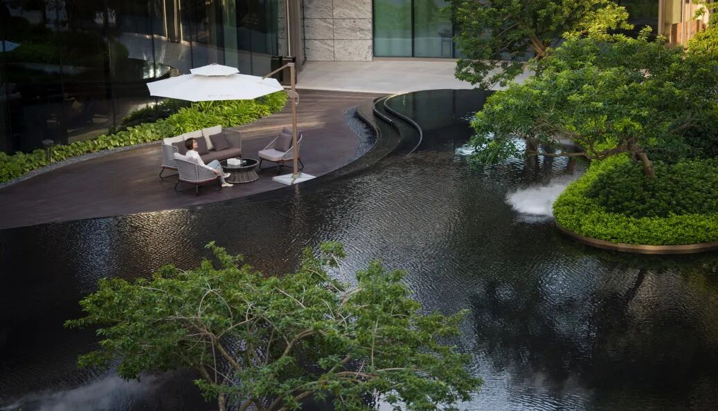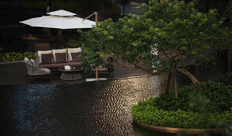 移步负二层,乌桕树造型优美,在水雾的弥漫下,庭里庭外,水底水面,柔和的光芒,宛如置身于林间般闲适自然。在院落中行走,宛如行于山谷的错落感。