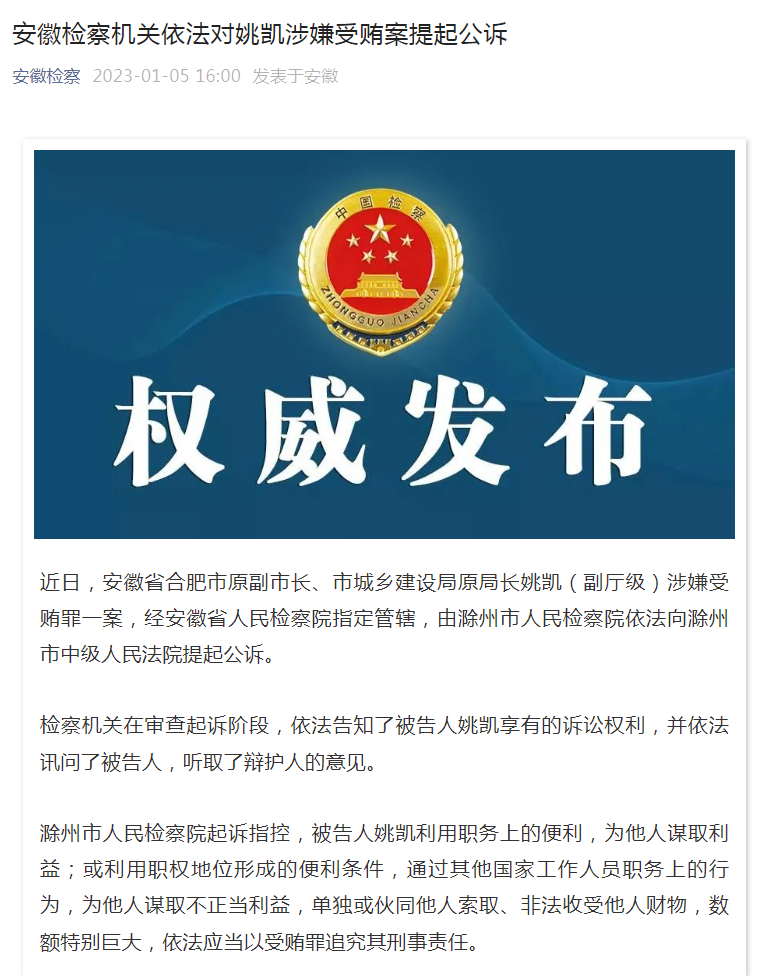 2、2023年1月5日,根据据安徽检察微信公众号消息,安徽省合肥市原副市长、市城乡建设局原局长姚凯被提起公诉