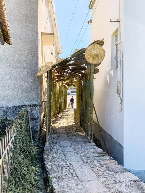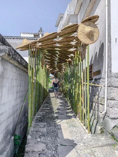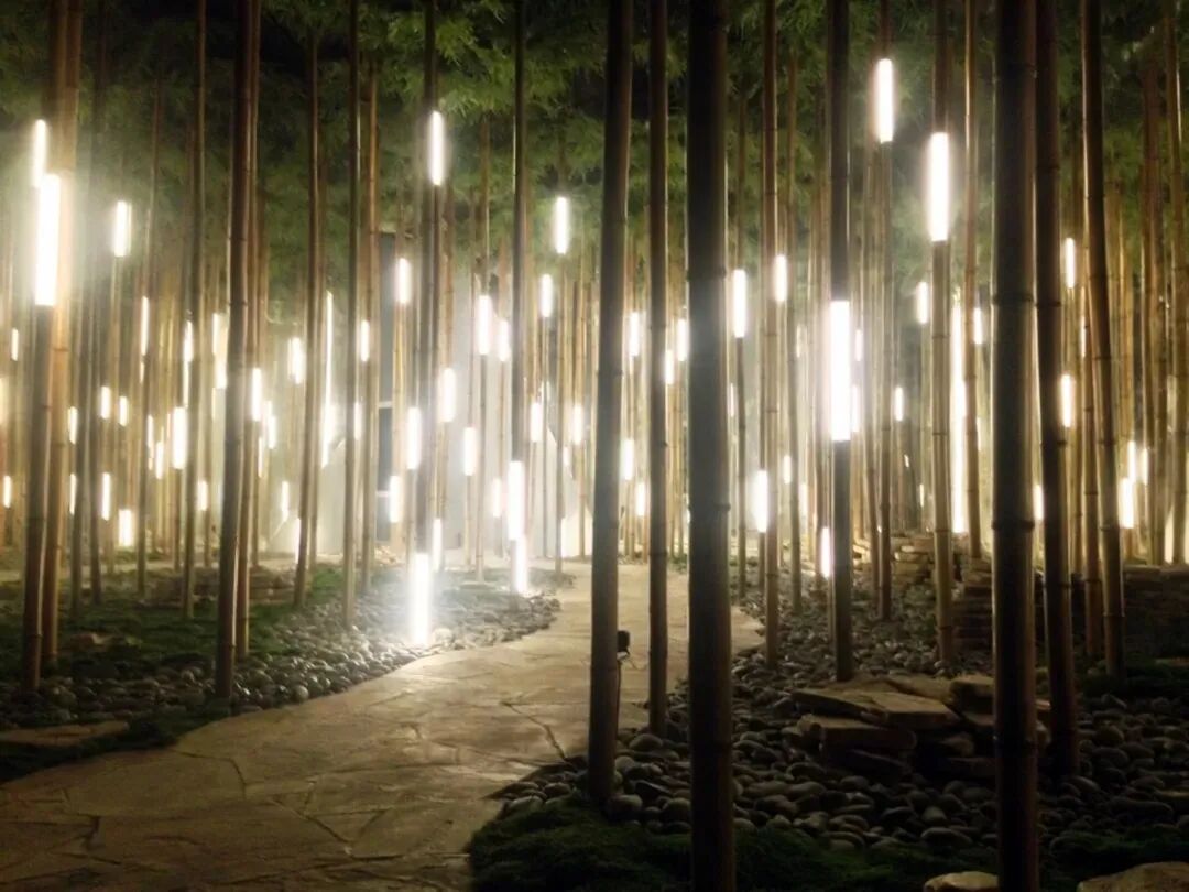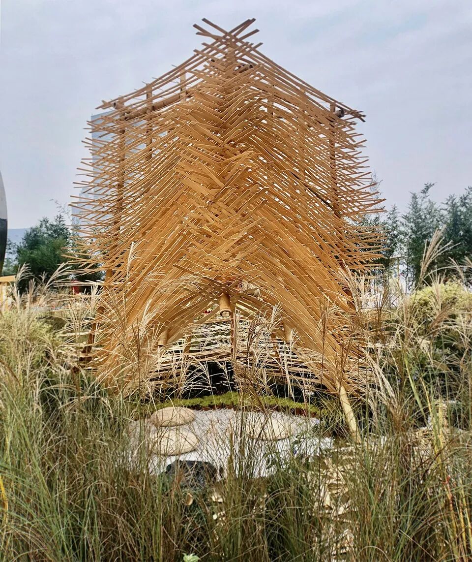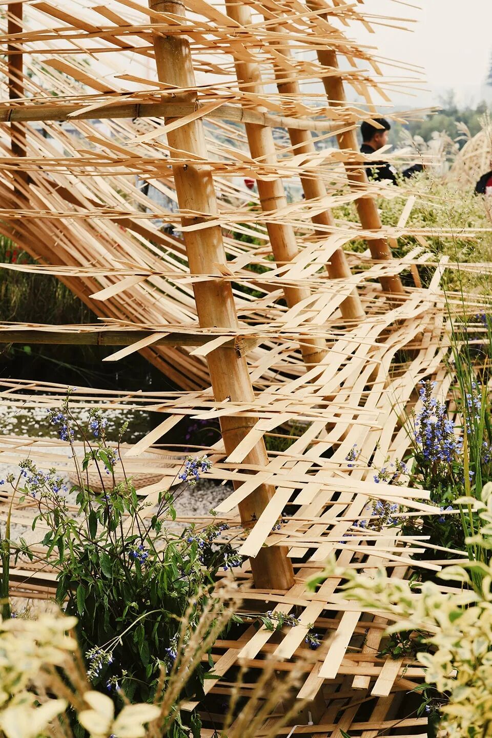 “隐亭”所用原竹均为曲竹,形态端庄之中更显清秀。三根主脚柱落地一根悬挑,配合两根次竹柱,再辅以竹皮拉结,最终使得重心控制在地面五边形内部,结构稳定。这个过程中充分感受到了竹材的刚度和韧度。