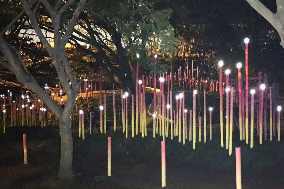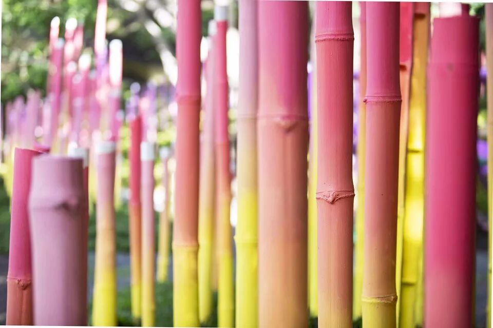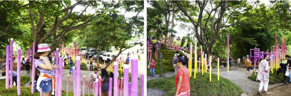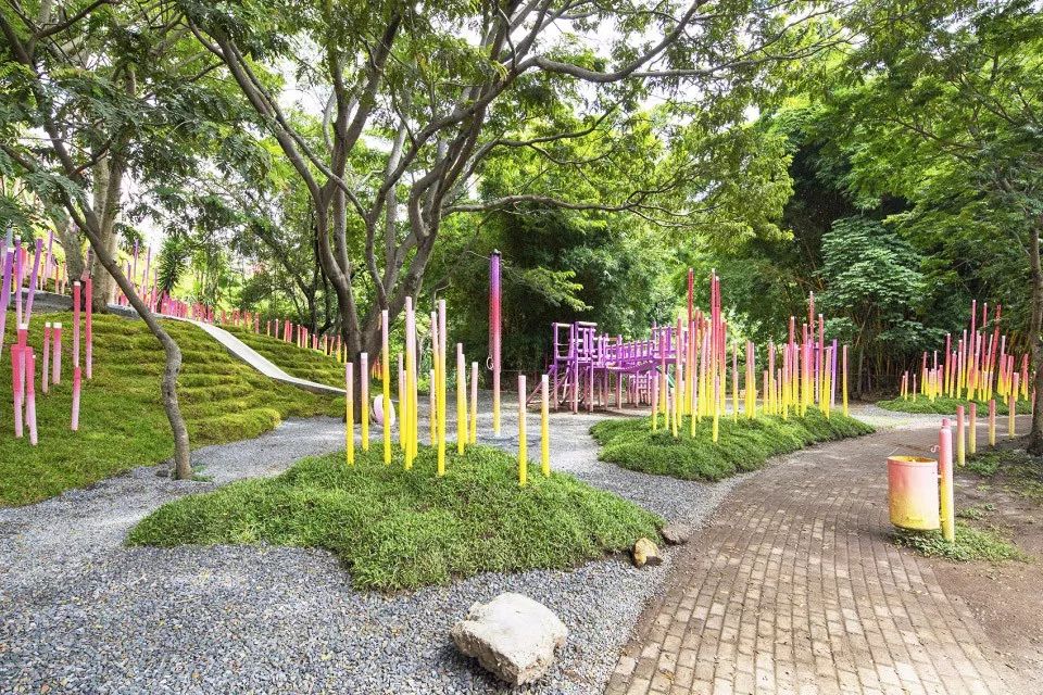 除了拥有丰富的色彩和趣味性之外,该装置还具有深刻的环保用意。为了提高居民对该地区空气污染的认识,竹竿的颜色还标志着污染的程度:从黄色(非常低)到紫色(非常高)不等。在项目的早期阶段,团队就进行了精确的空气污染测量,以便确定每个区域要使用的色调。Parque O2的环保实践既活跃又具有教育意义。通过将竹子表面的涂料与二氧化钛(一种高度光催化和反应性的化学物质)混合,这种装置实际上减轻了空气本身的污染。二氧化钛由紫外线激活,当暴露在微粒物质和污染物中时,有能力将它们转化为有机分子,然后雨水便可以将它们从竹子表面冲走。
