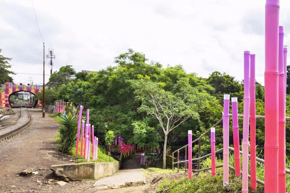 最终打造而成的是一片被绘制成黄、金橘、粉红和紫色的渐变竹林。它们创造出一条蜿蜒的小路,将Polideportivo公园的主要节点与附近的铁路连接起来。场地被形态各异的草坪进一步塑造,这些草坪还作为不同模块竹林的基座。该装置占地总面积约2,000平方米,包括600个填充有砾石和碎石的再生轮胎(用作防洪土墩和土壤固持)和总长约1,200米的竹子。