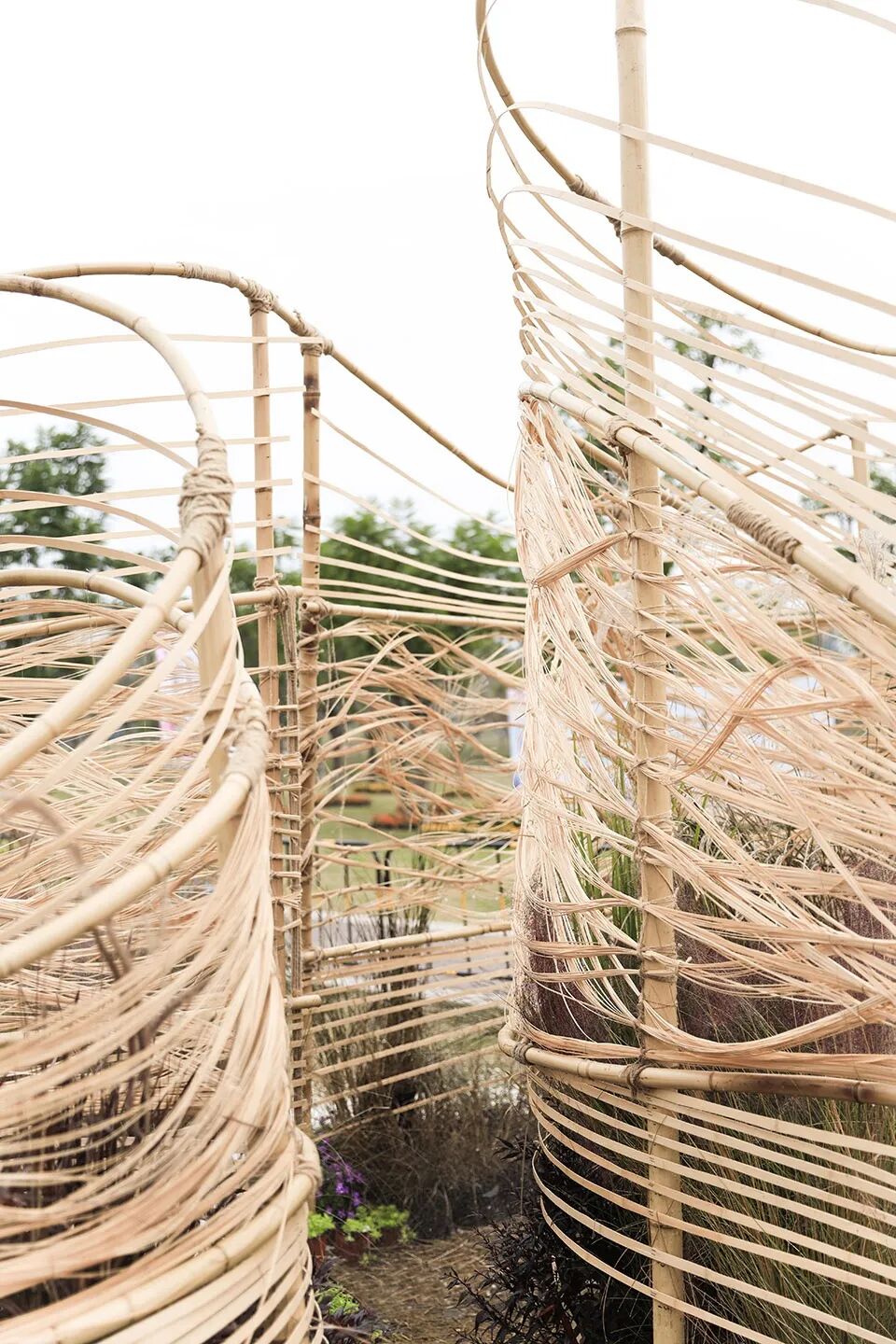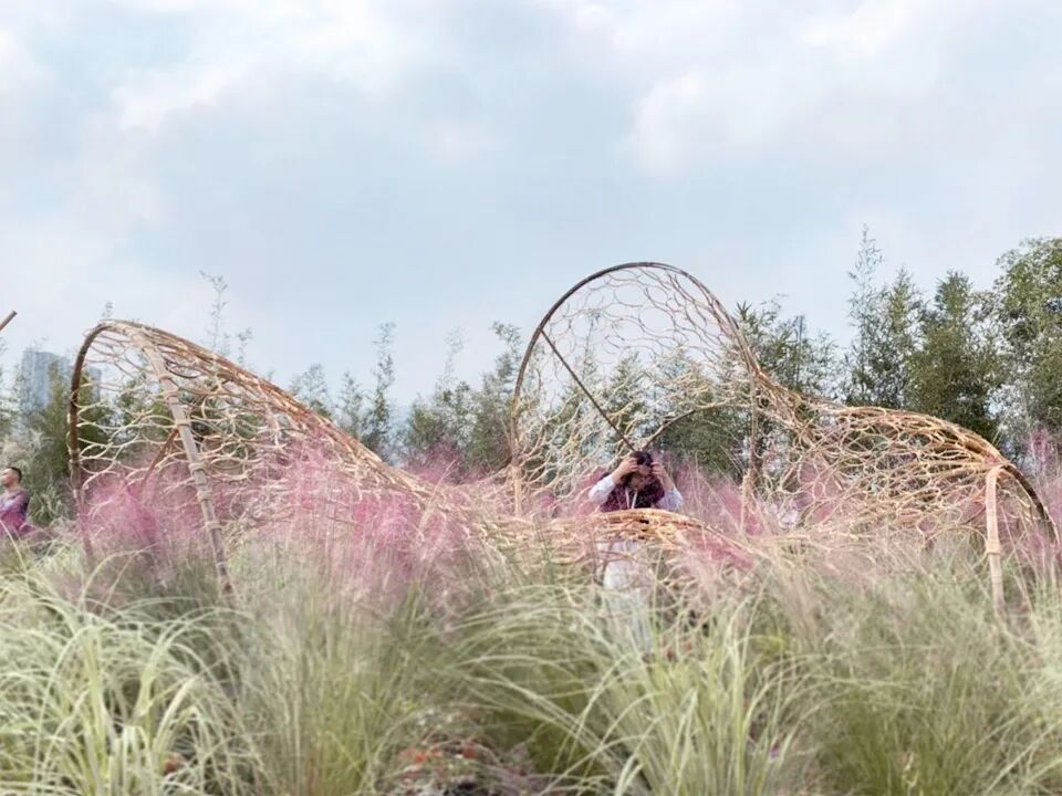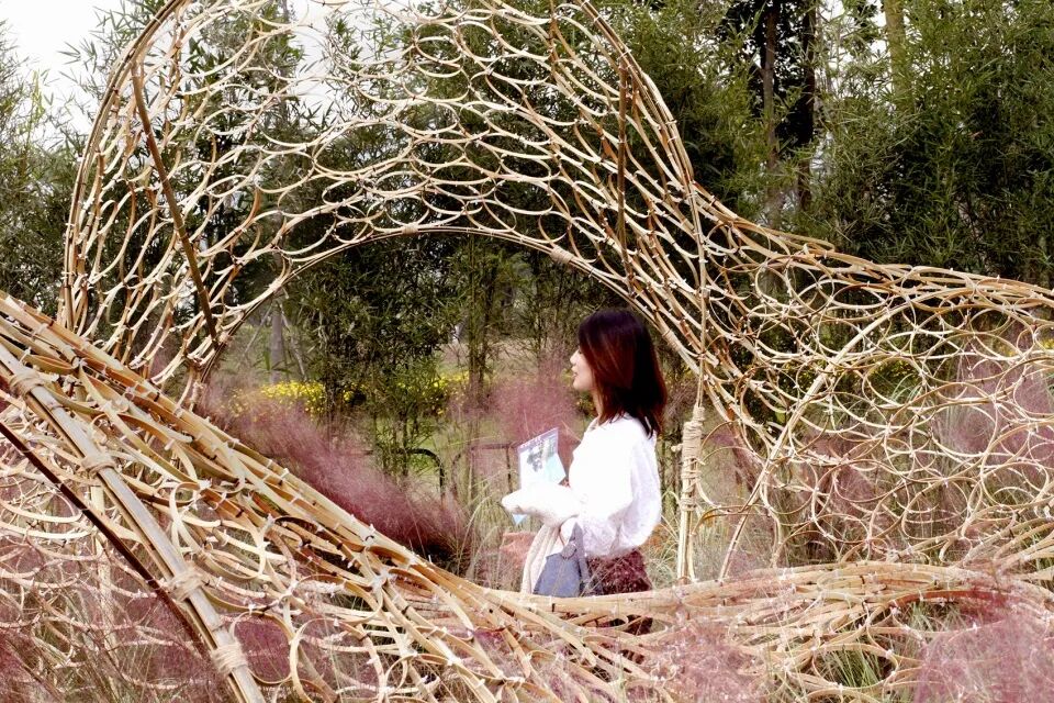 以粉黛乱子草、狼尾草等观赏草为主要植物,构建花园的基调氛围。在植物的衬托下,编织立面显得更加柔美灵动,仿佛阳光下水面金色的波纹。