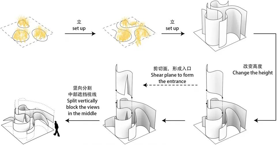 我们将破土而出的竹笋做为一个基本单元形式,像竹林一样,挨个簇拥在一起,底部盘旋缠绕的竹根做为联系单个竹笋的纽带,结合笙高低错落的形态,通过手工模型形成了初步的构思。对实体模型进行整理后,我们再对每个基本单元之间以及与设计场地边界的相交部分进行切割,形成了最终的形态。