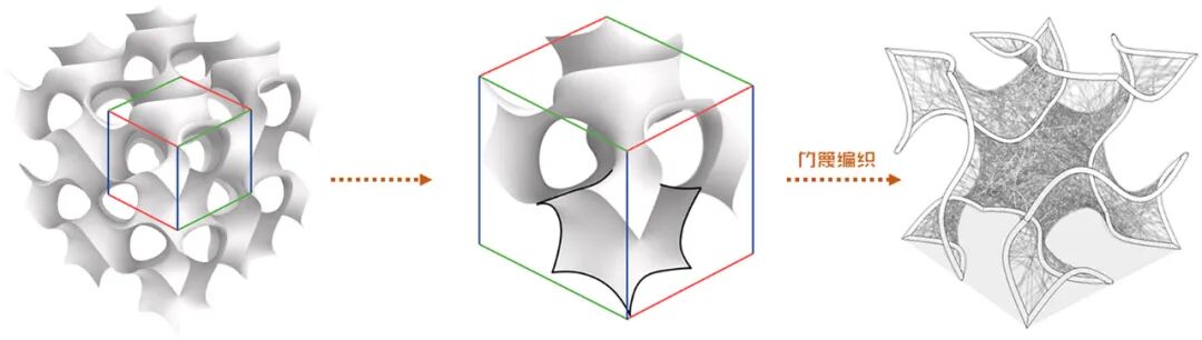 设计利用参数化设计手段、标准单元模数,将数学中的Gyroid minimal surface作为设计原型精确“模拟”了太湖石的空间形态。将复杂的孔洞空间浓缩为三种简易的竹构件,以自由编织的竹篾为覆面。将东方的赏石文化和西方的形式科学相融合,最终营造出“别有洞天”的秘境花园。