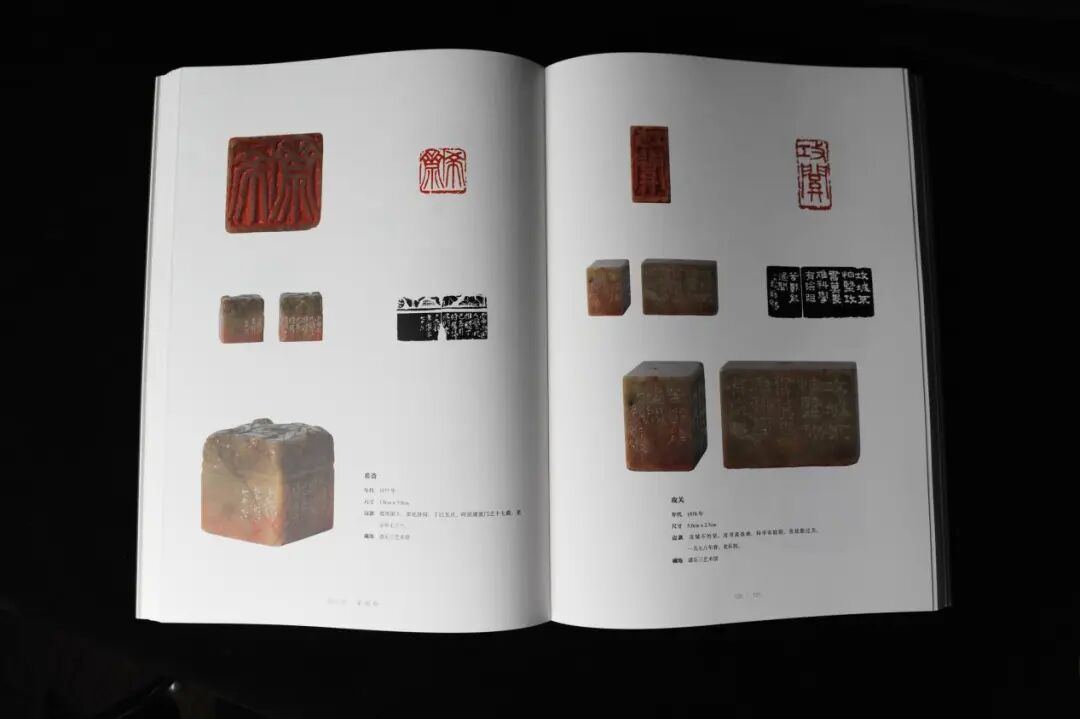 三卷画册为8开(260mm*370mm);装帧形式为布面精装,封面采用墨绿丝质布料搭配书脊深灰棉质布料,文字信息采用乳白丝印压凹工艺。封底针对不同卷的内容选择了相应的印章,花鸟卷——“百花齐放”,篆刻卷——“美不老”,综合卷——“既寿”。内文经过反复对比、打样,选择了最高还原度且更适合翻阅感的涂布玛歌纸,纸色偏米白,试图原汁原味地展现诸乐三先生精到而严谨,苍劲亦不失清新之气的书画作品。