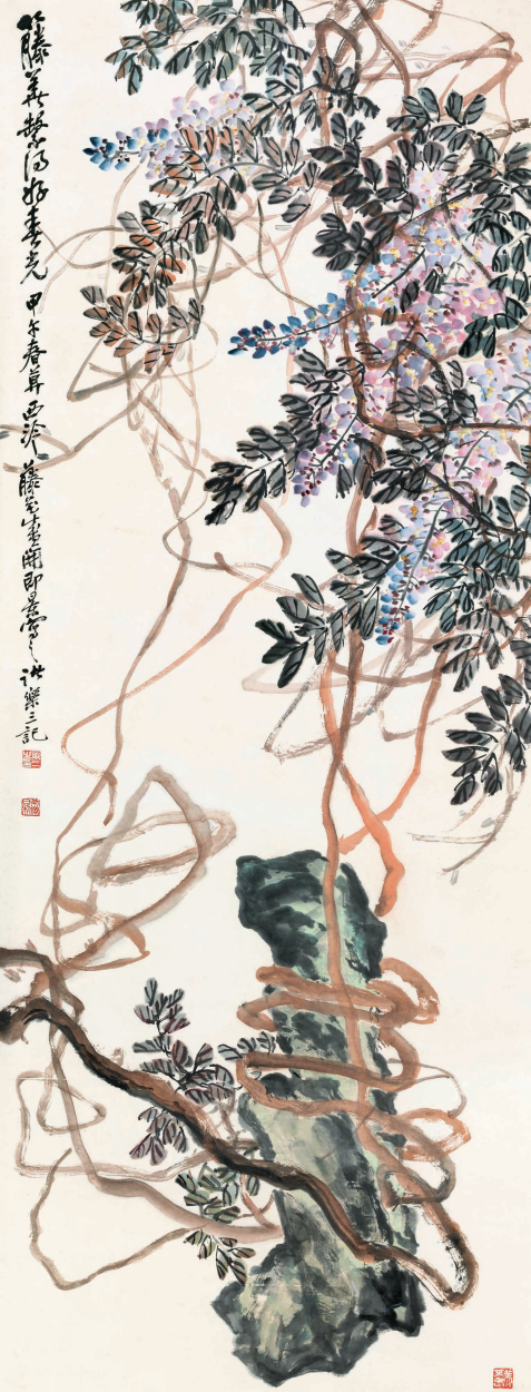 款识:藤花系得好春光。甲午春暮,西泠藤花盛开,即景写之,诸乐三记。