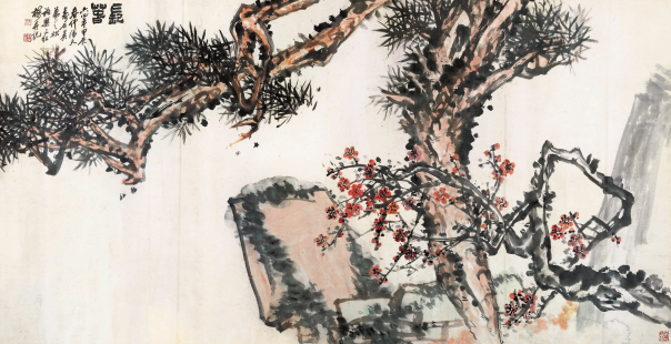款识:长春。六四年甲辰春仲,潘天寿石,吴茀之松,诸乐三红梅并记。