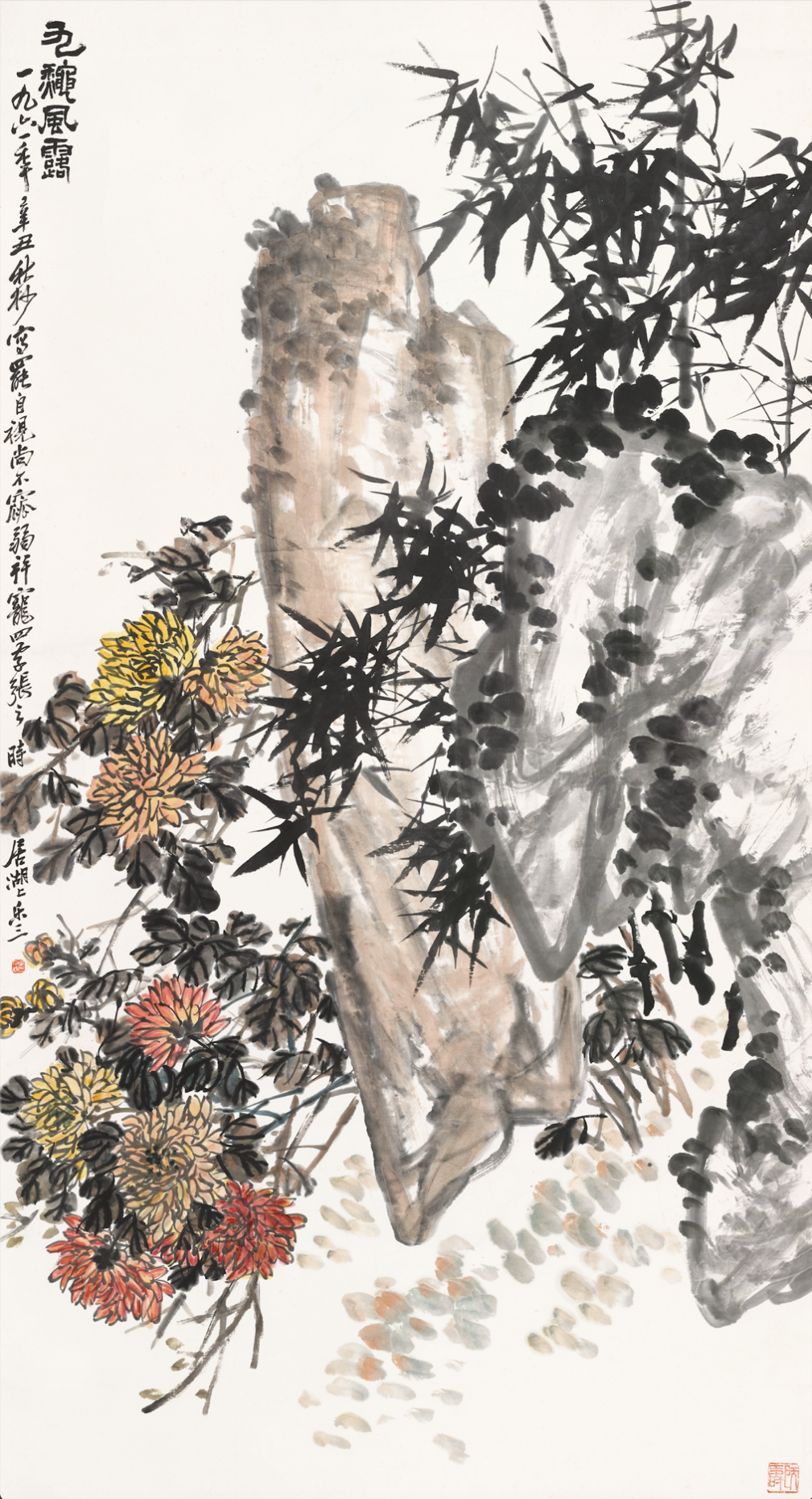 款识:九秋风露。一九六一年辛丑秋杪。写罢自视,尚不窳弱,并宠四字张之。时居湖上,乐三。