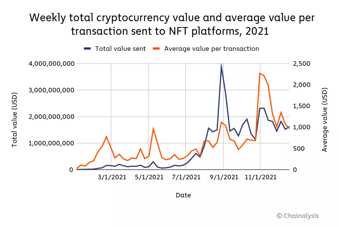 2021年每周在NFT平台发生交易的加密货币总值以及每笔交易的平均值一览 (来源:Chainanalysis)