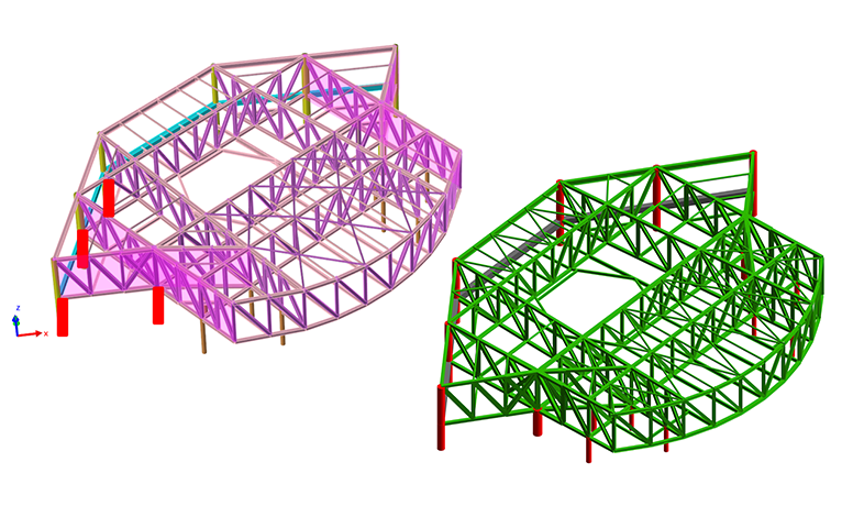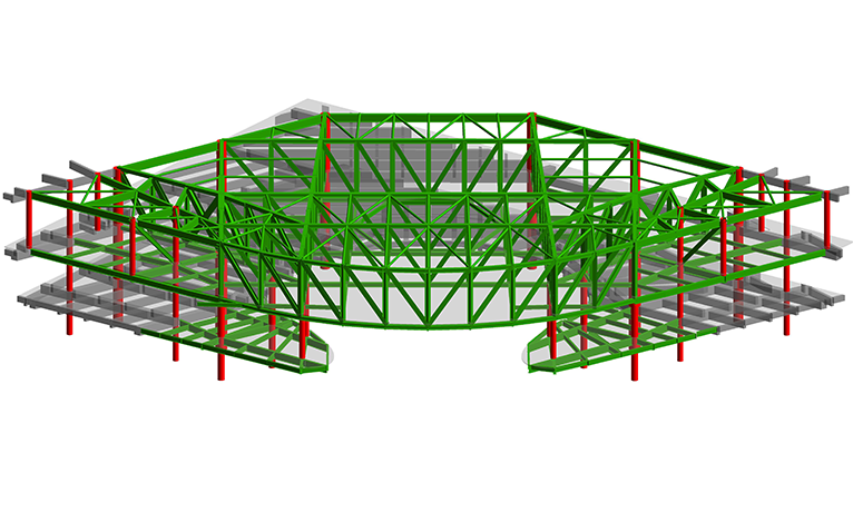 我们与幕墙专业紧密配合,进行结构-幕墙一体化设计。设计团队在两侧枢纽中心的大空间处,采用结构柱支撑幕墙横向钢梁;顶部悬挑桁架靠近幕墙处用桁架构建支撑屋顶塔冠;采用屋顶转换柱支撑主楼顶部设备层幕墙的格栅造型。