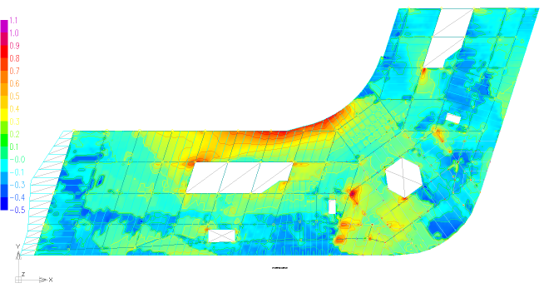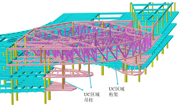Urban Core桁架区域大跨度的吊挂结构,在竖向荷载下结构变形、应力较大,导致楼板容易开裂,需要考虑施工顺序对钢构件设计的影响。奥雅纳结构团队利用必要的施工措施,如设置施工后浇带,以减小混凝土楼板核心层在重力工况下的拉应力,满足楼板核心层不开裂的要求。