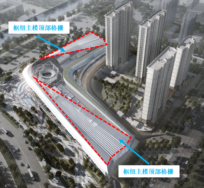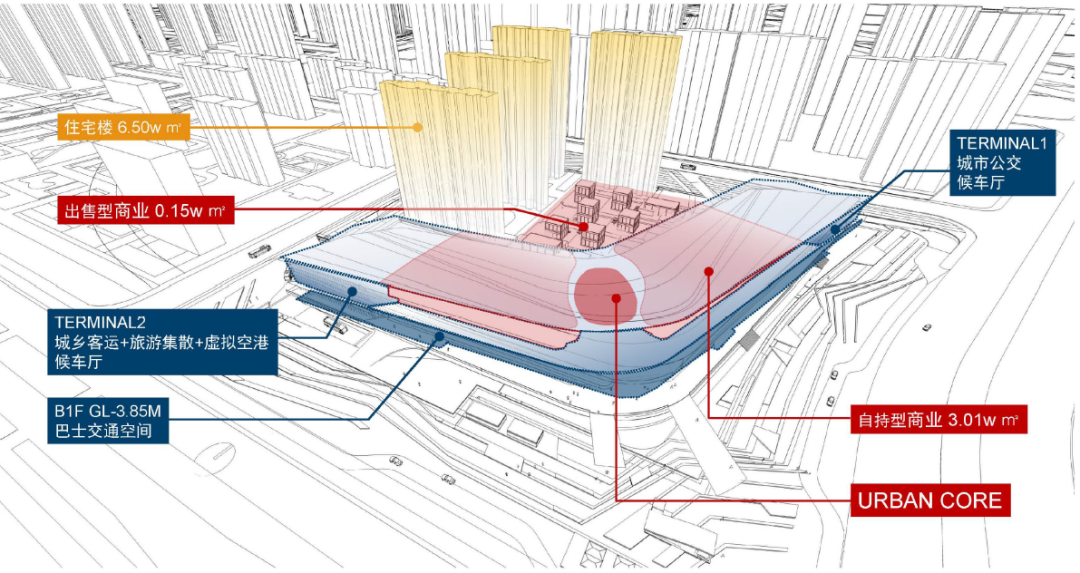 地上枢纽主楼动线明快,新颖的 L型平面两端主要用于公交候车及城乡客运、空港巴士、旅游集散,服务于吴江-苏州-长三角,加速推进同城一体化发展。L形的东南拐角处被设计为城市核空间(Urban Core)—— 有效连接公交、地铁、停车场和商业。