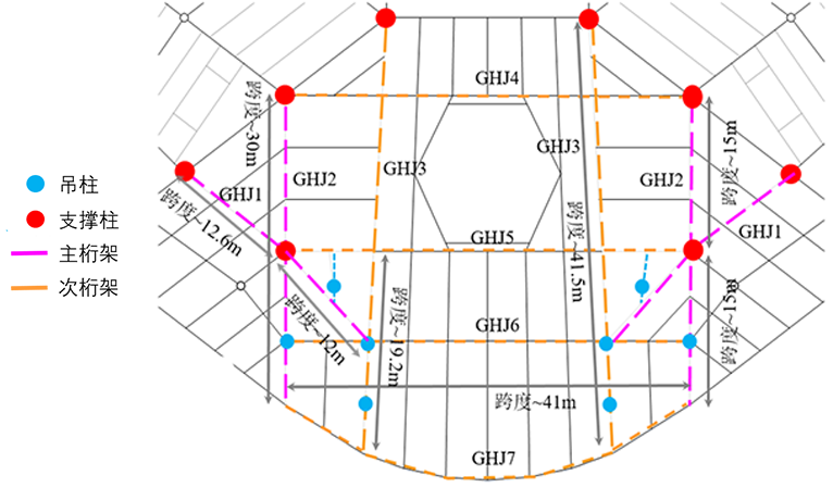 枢纽主楼二层轮廓线比首层外凸约10米,三层轮廓线又比二层外凸约10米,屋面下无柱空间跨度约40米,悬挑长度最大约达22米。大跨空间和超长悬挑的建筑设计要求给结构设计提出了挑战。通过几轮方案讨论,奥雅纳结构团队最终确定采用屋顶钢桁架+吊柱结构方案以实现建筑造型。