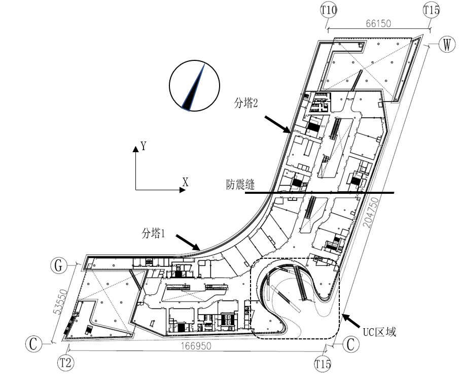为了减少L形平面对结构抗震的不利影响,我们在L形拐角处设置了一条防震缝,将枢纽主楼地上范围分为分塔1及分塔2。此方案有效减少了因楼板超长而需增加的温度收缩钢筋,减少抗震严重不规则项,优化了结构的整体造价。