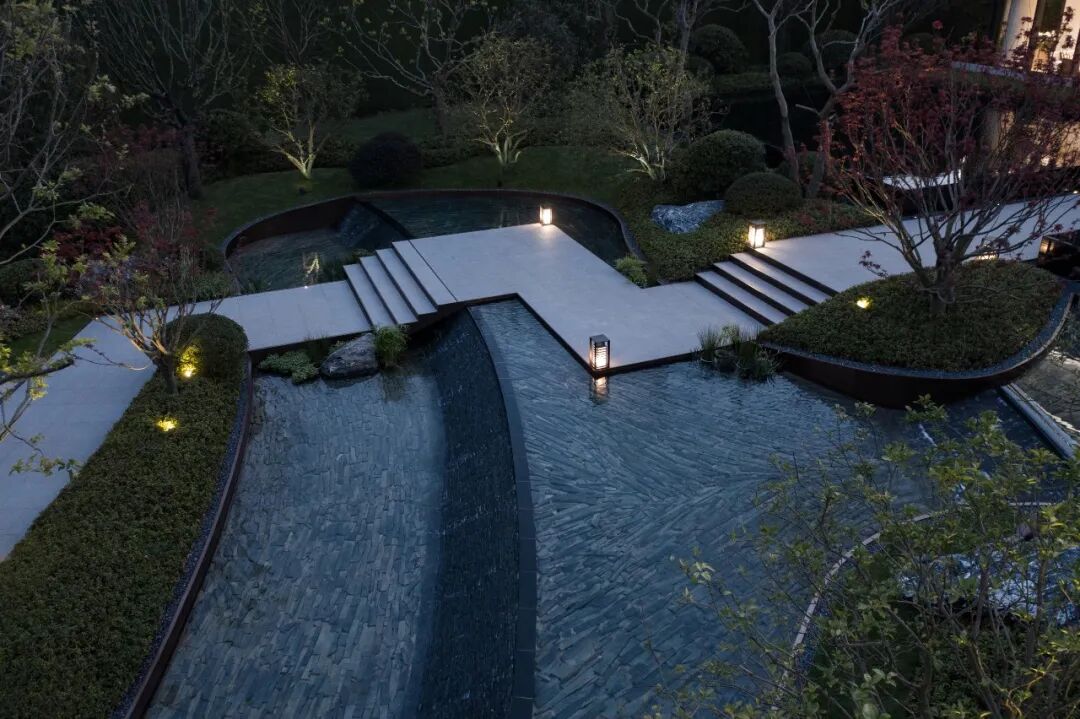 在前期规划的时候,景观提出将建筑提高,以便为客户在场地的行走中提供一个沿阶而上、踏水而归的氛围。设计特意将这部分高差放在了场地后部分解决,结合吧台、叠水、树池,一步步的走到建筑面前的大水面空间。