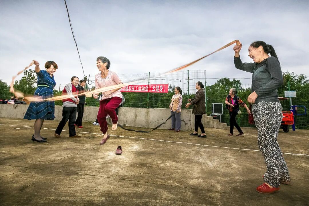 2020年9月28日,在四川省资阳市雁江区,脱贫村六石包村举行跳绳比赛。受疫情影响,四川籍农民工运动会以“云健身”的形式开展。彭晓秋 摄(“筑梦——我们的新时代美术 摄影作品展”参展作品)