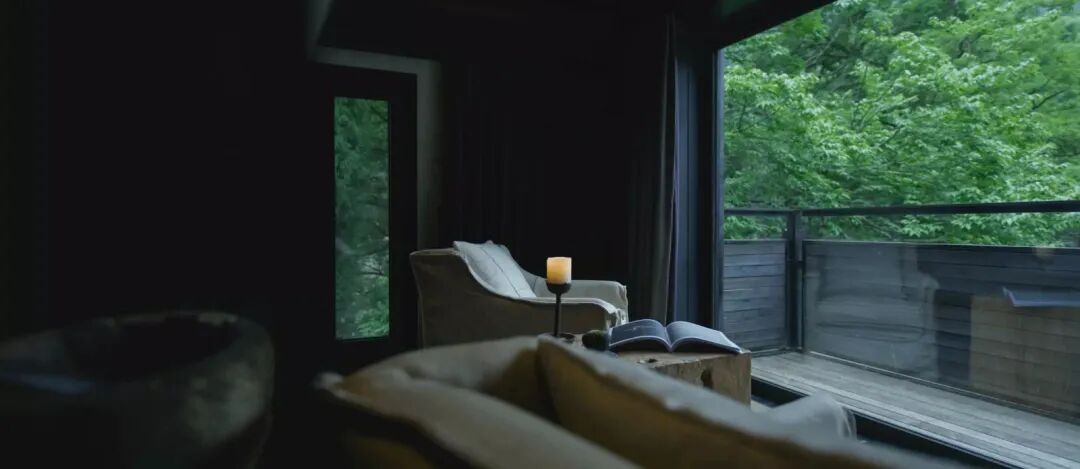 民宿大堂原为进山的山路,保留原有的侧面山体,在上面加建玻璃结构,将自然空间纳入到室内,打造成为民宿的大堂,室内配置壁炉、沙发等满足现代需求的设施,满眼望去,都是苔藓、蕨类,乡野之气,扑面而来,同时空间使用极尽舒适,将自然与现代进行完美的融合。