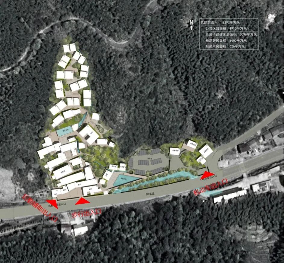 建筑功能信息:远离整体组团的建筑,作为后勤用房,靠近山脚交通干线的建筑作为公共空间,山林深处较为安静的区域为客房区;