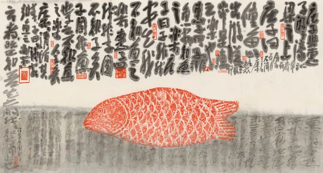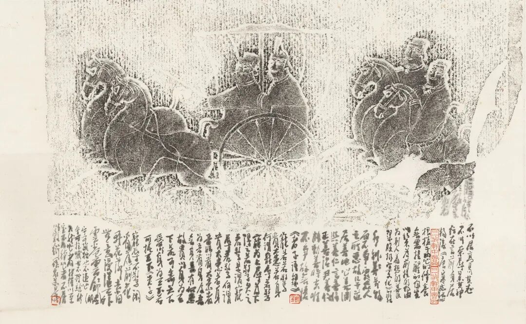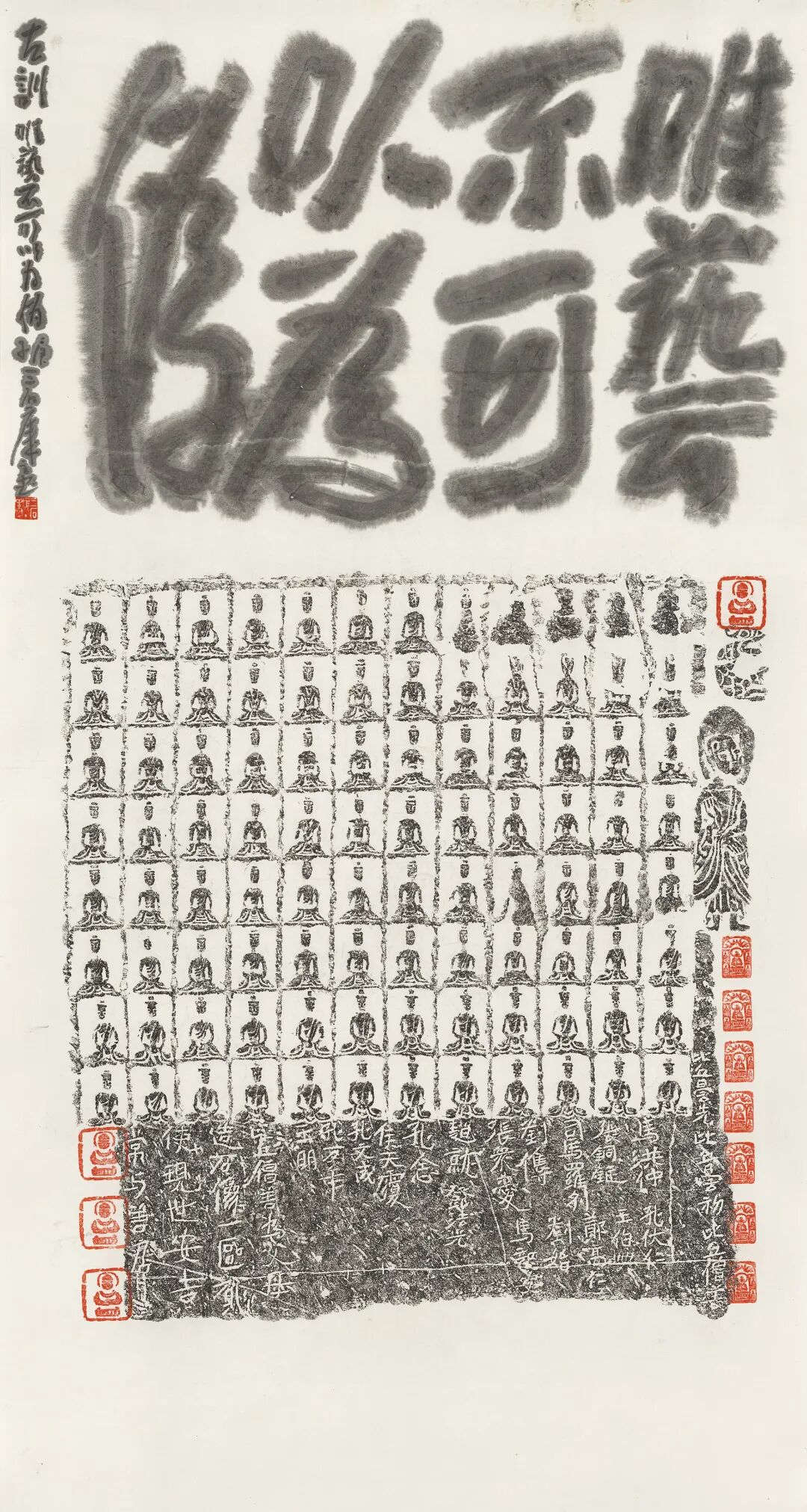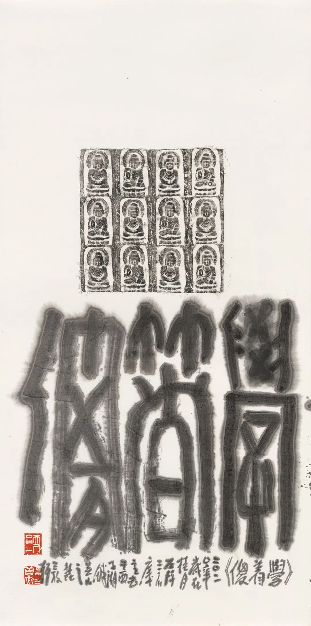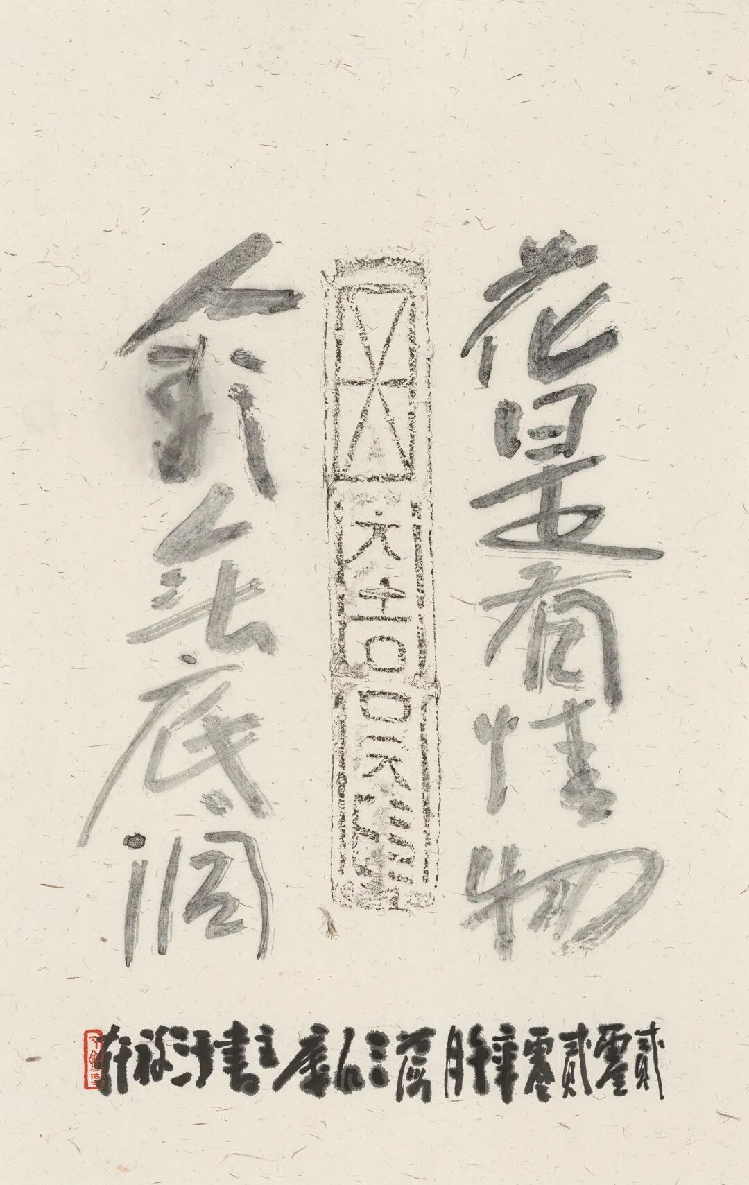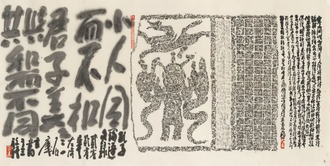 全科医生型画家曾宓先生格调技巧当代一流的“宓境”之画符号性强,“营养丰富”,吸引无数“蜜蜂”,奠定了他在绘画界的至尊至隆地位。曾宓先生独具一格的书法创作也啸傲书坛多年,而他的近期金石拓片题跋书法的“宓境”无疑会让真正懂书法史的人惊呼意外:原来书法不仅可以这样写,并且可以与金石拓片的“图铭”合二为一,成为既能指向内容形式,又能指向意象情趣的“美术创作”。没错,曾宓先生的书法自始至终都是美术的,如果缺乏这个认识前提,我们对曾宓先生书法的评价就一定只能是隔靴搔痒了,遑论客观。