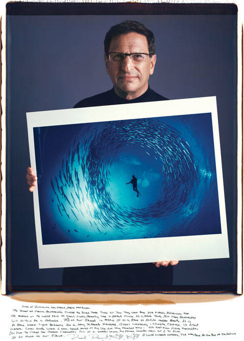 David Doubilet:一群梭鱼分三次围成了一个巨大的圆形,然后啪地一下又全部回到深海中。在海洋中没有直线的存在, 这个圆形诡异如几何学中的圆形一样完美,但是梭鱼这样做不过是为了防御敌人……地球有70%都是海洋,在这里,有无限的美,在这里,光的作用大为不同。