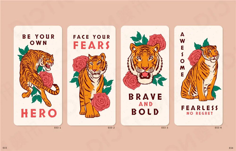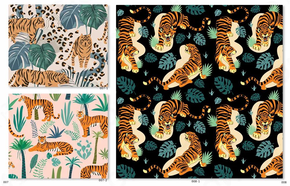 当老虎变得懵懂可爱时,给人“萌萌、可爱、融化、疗愈”的感受,结合大自然元素与小老虎呆萌的肢体动作,童趣感十足的诠释着小老虎的可爱风格,既柔和又温馨感的色调更是给图案营造出欢乐纷繁的氛围。