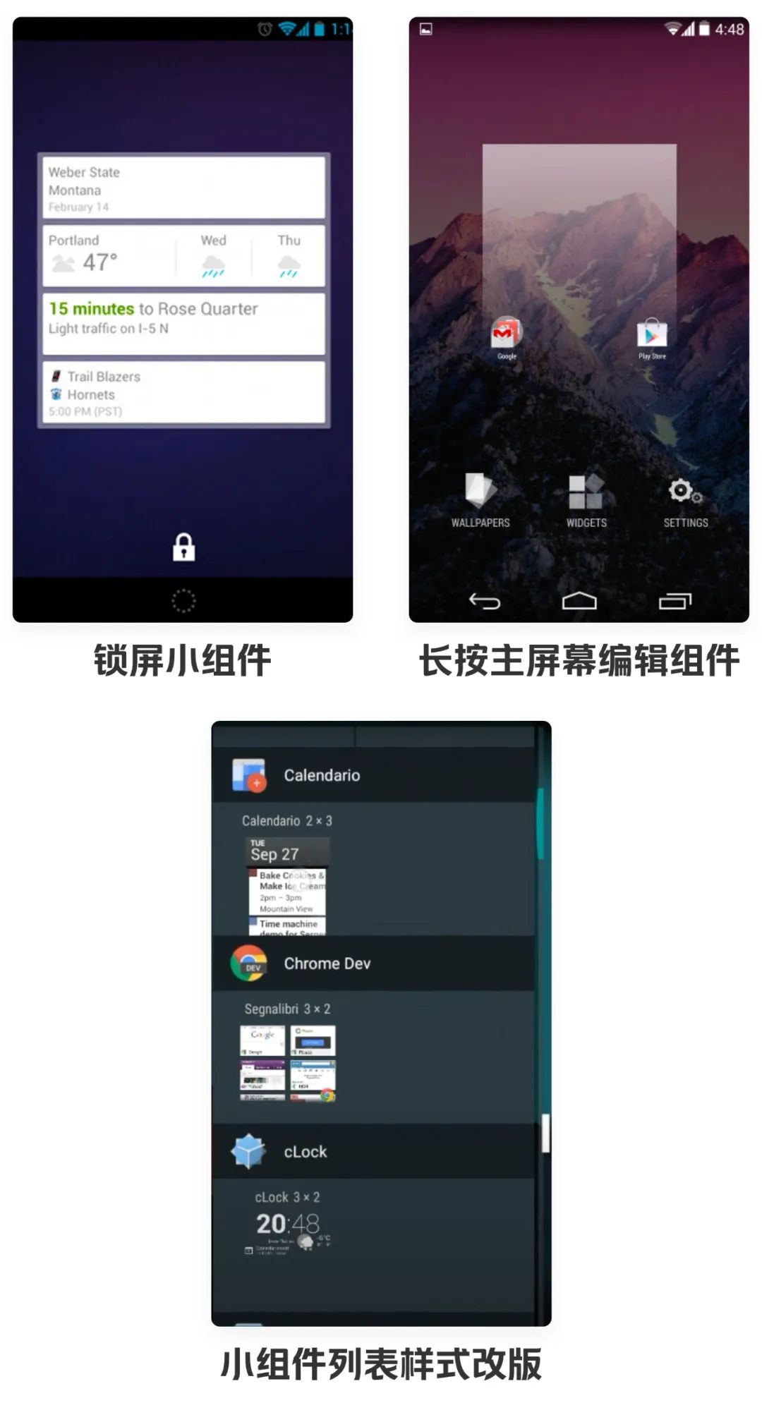 Ice Cream Sandwich的这套设计撑了1个版本,后续的多个版本中又对小组件的交互进行了调整,“软豆糖Jelly Bean”中首次出现了锁屏小组件、“巧克力条 KitKat ”中取消了菜单中的小组件tab,改成长按首页触发小组件设置。“棉花糖 Marshmallow ”调整了小组件设置的排版样式。自此,基本形成了安卓组件交互的稳定模式。