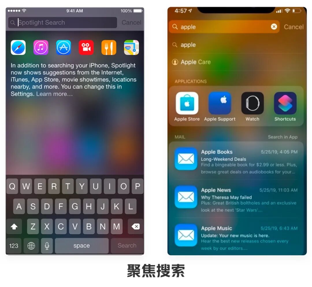 “找”的场景基本支持了,接下来苹果又调转方向去支持“看”的场景。在iOS10,苹果终于还是做了负一屏,并且将其与搜索功能做了强聚合,在滑动负一屏时搜索功能始终固定在页面顶部。
