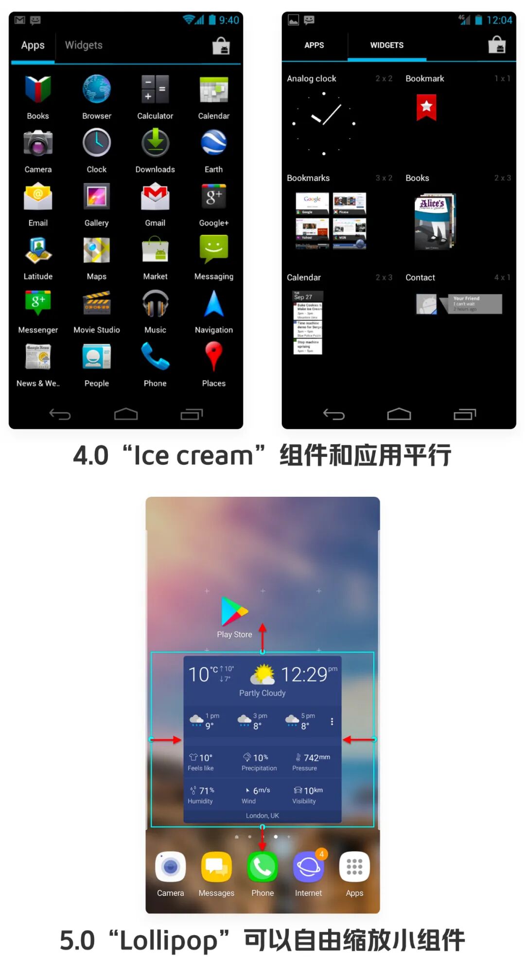 这套设计一直坚持到了2011年安卓4.0“冰淇淋三明治 Ice Cream Sandwich”。在这个版本的架构中,小组件不再只是应用的快捷方式,而成为了和应用平行的一套服务。在菜单中多了一个“小组件”tab,你可以直接从这里挑选喜欢的放在桌面上。